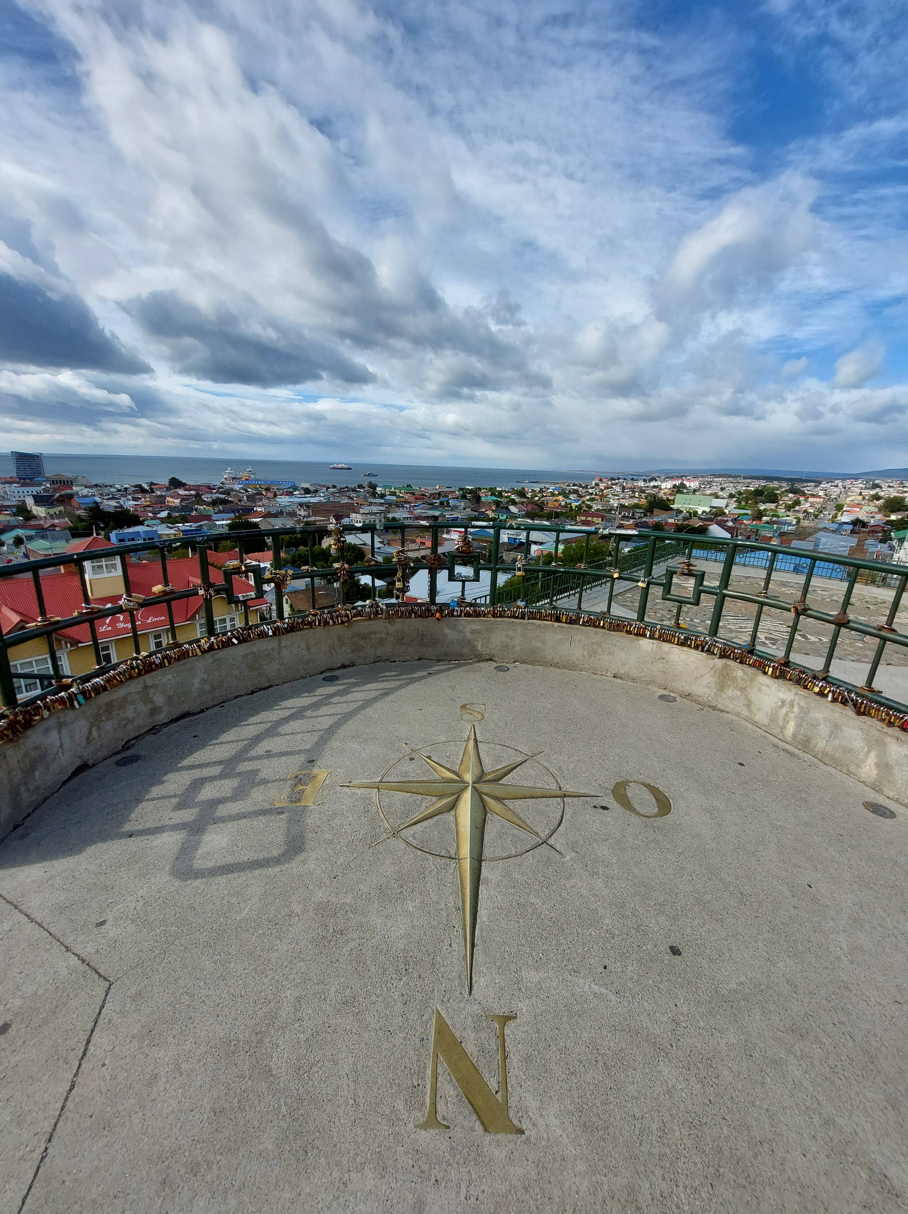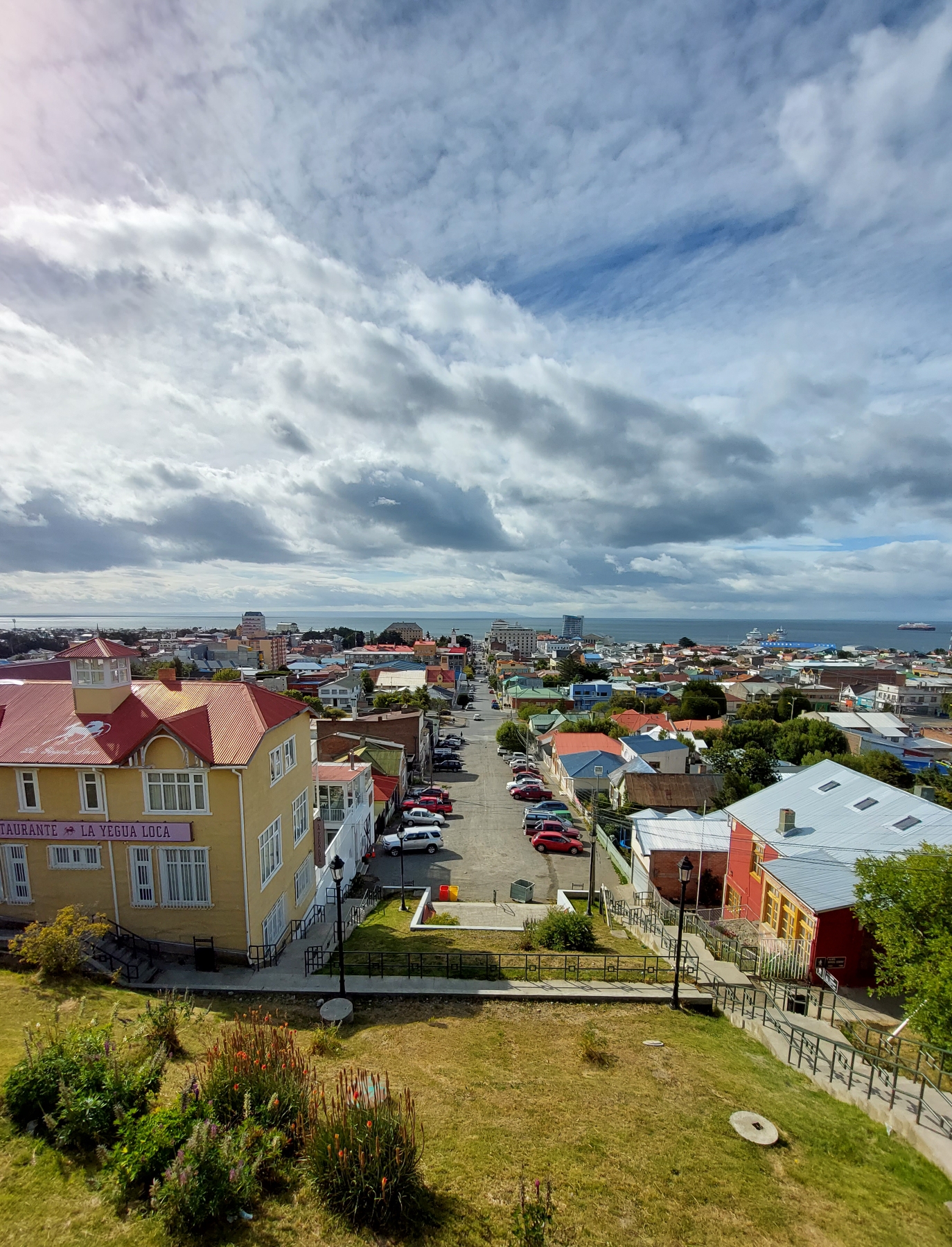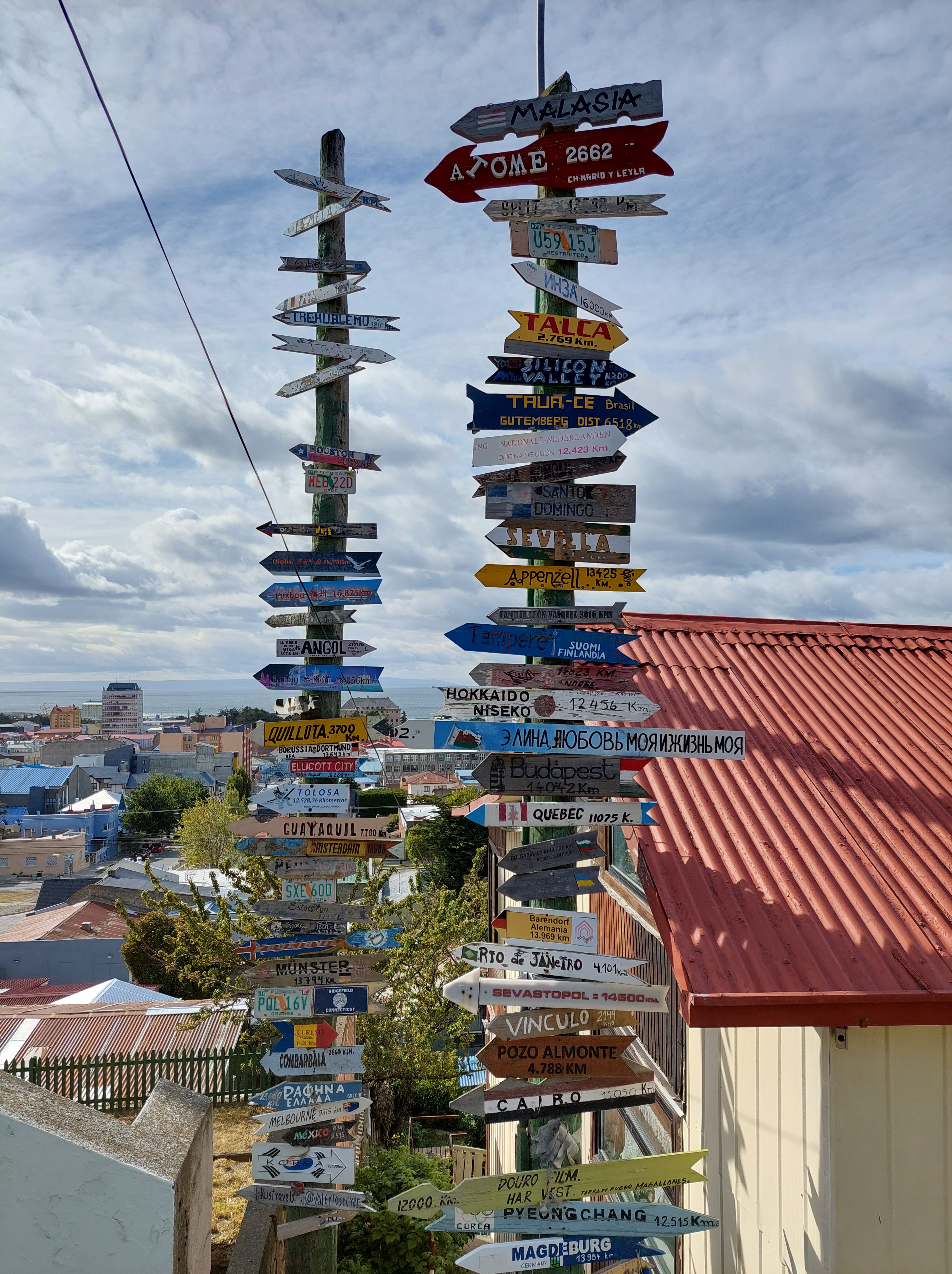 Anstatt dessen entscheide ich mich die Stadt zu Fuß zu erkunden. Erster Stop ist ein kleiner Hügel im Zentrum der sonst sehr flachen Stadt. Von hier aus hat man nicht nur die Stadt im Blick sondern kann auch die täglich im Hafen anlegenden Kreuzfahrtschiffe sehen. An einem nahen Wegweiser Stelle ich fest daß ich momentan um einiges näher an Japan als der Heimat bin.