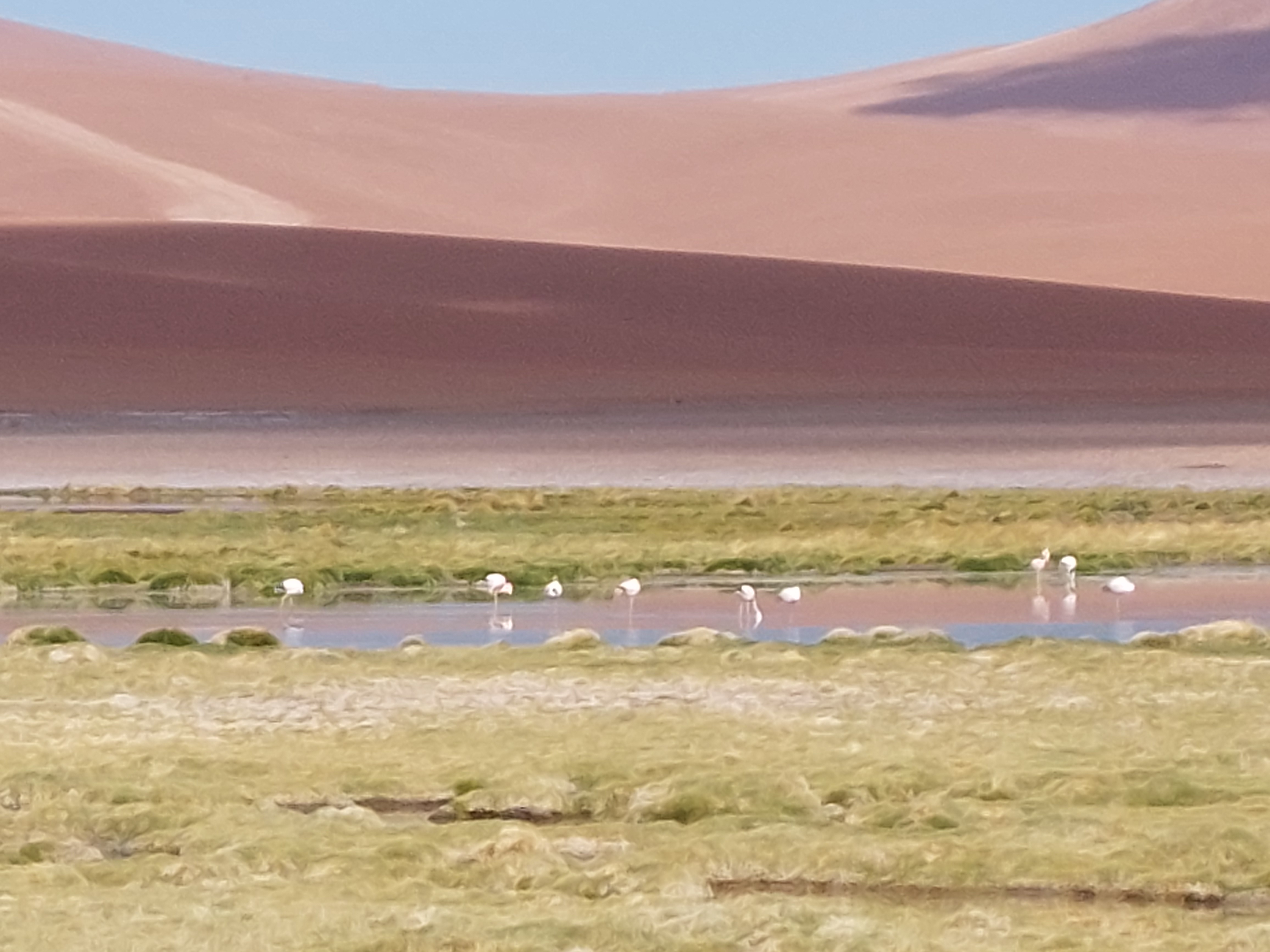 Um 08:00 geht’s los und es geht gleich stetig bergauf, man merkt das auch dem Bus die Luft ein wenig wegbleibt. Erster Stop ist ein Aussichtspunkt auf den Vulkan Licancabur. Der knapp 6000 Meter hohe Vulkan ist zwar auch von San Pedro aus gut zu sehen, von hier sieht man aber erst wie massiv er ist. Während wir etwas Frühstücken können wir auch die Fauna beobachten. Neben Flamingos, welche die über die Route verstreuten Lagunen beheimaten, gibt’s auch Lamas, Guanakos und ihre kleineren Verwandten die Vicuñas zu sehen.