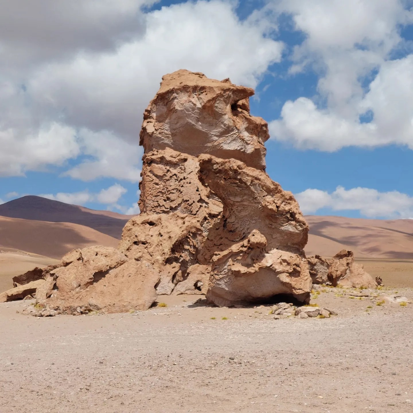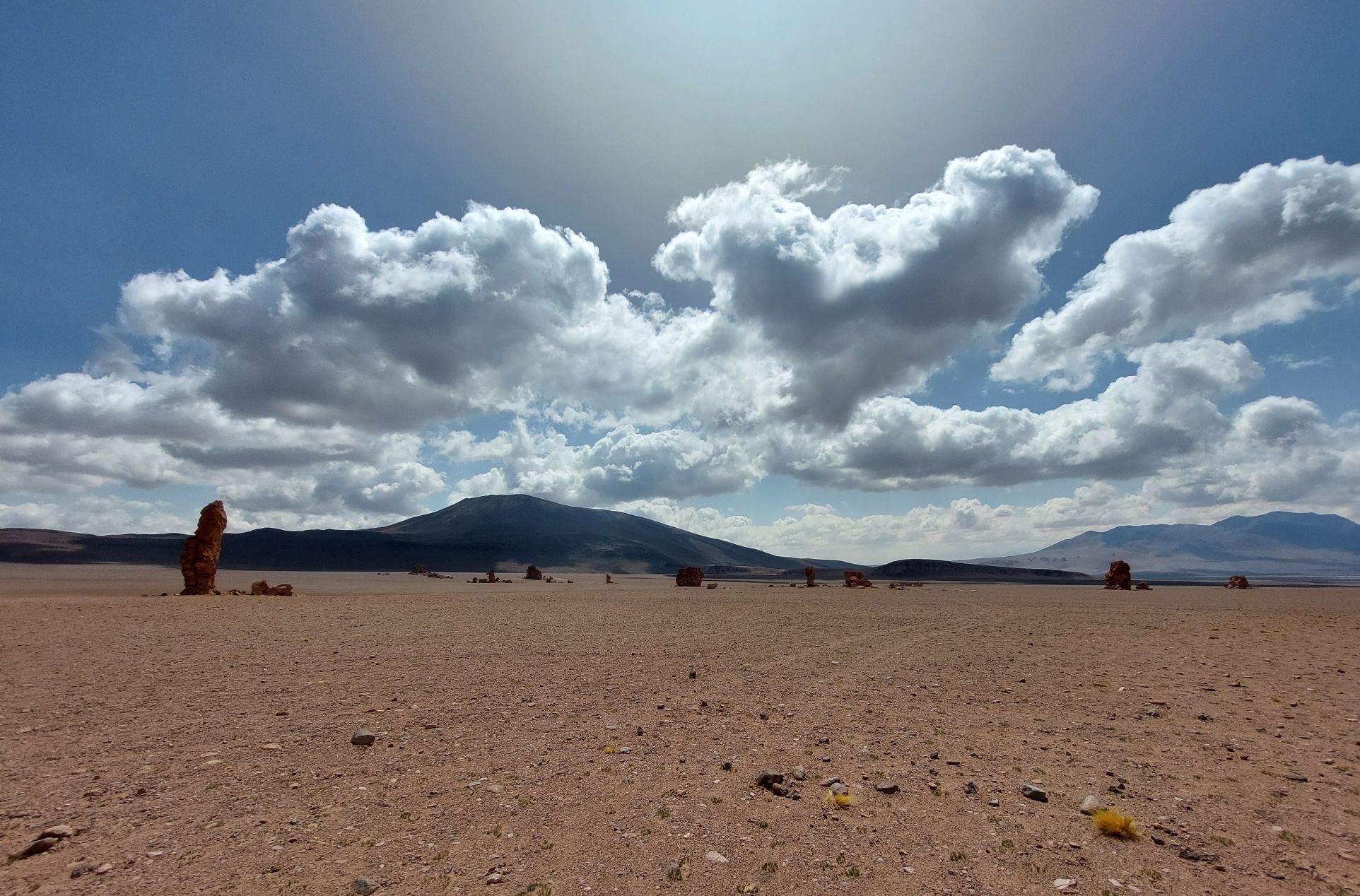 Weiter geht es über eine Passhöhe bis auf 4800 Meter. Hier spürt man dann doch, dass die Luft dünner ist – vor allem wenn auch noch Schutzmasken getragen werden müssen. Im weiteren Verlauf de Tour besuchen wir, wie der Name schon verrät, einige Salzseen sowie eine Hochebene, auf der über Jahrtausende verwitterte Steinsäulen zu sehen sind. Eine davon soll den chilenischen Schriftsteller Pablo Neruda darstellen.