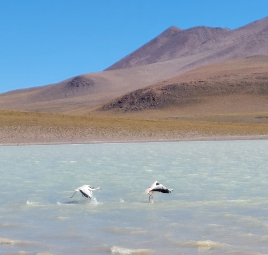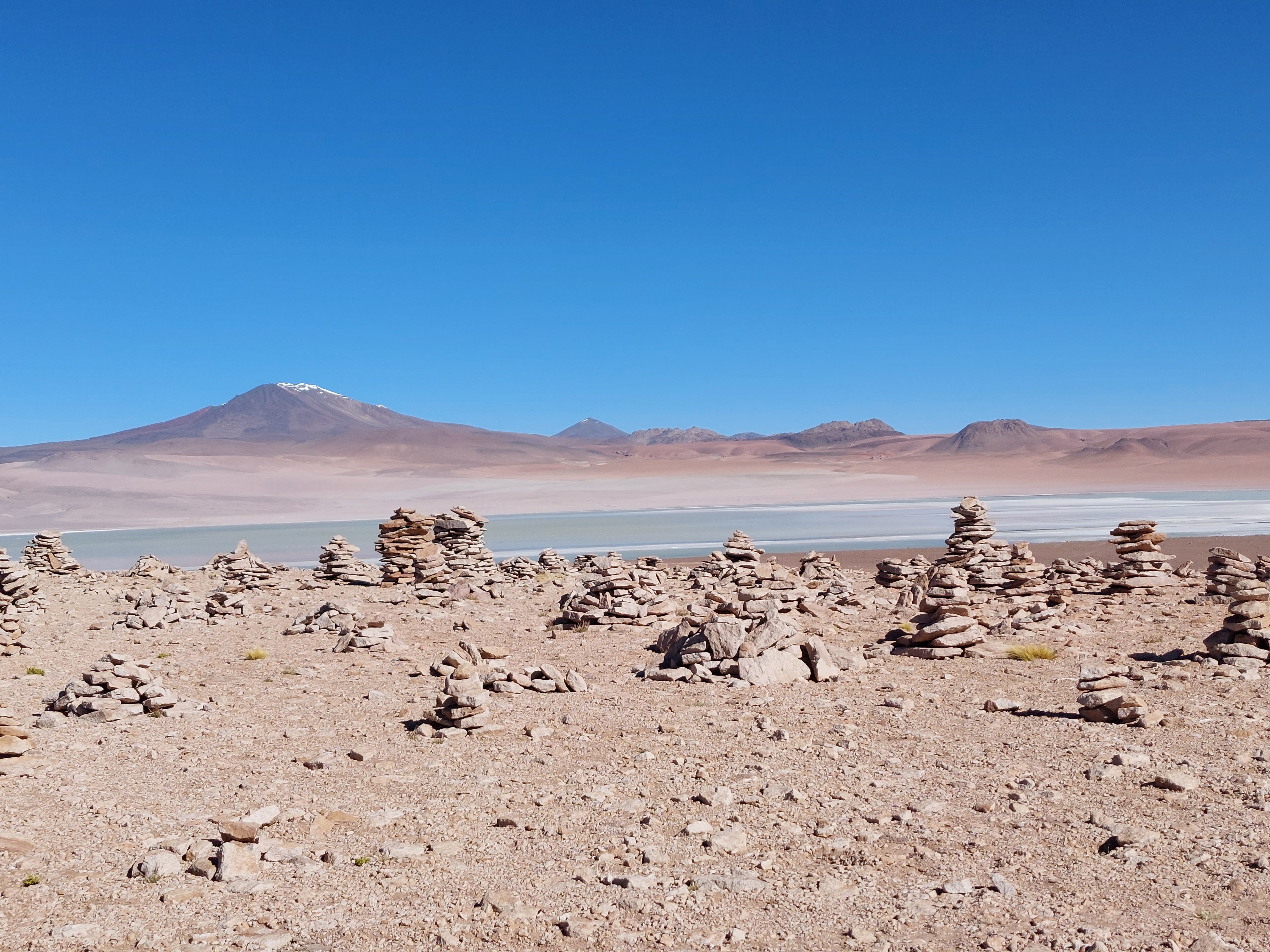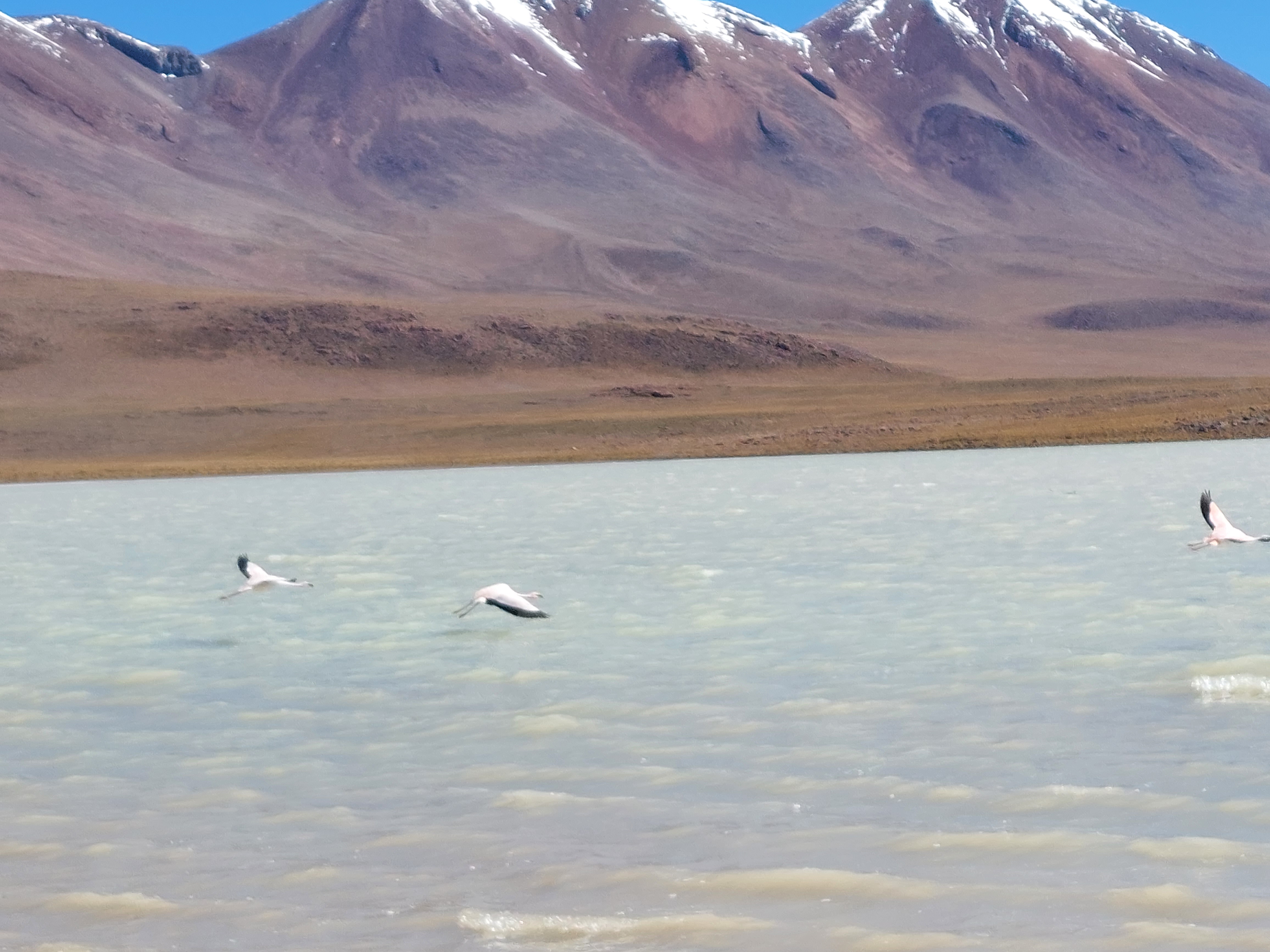 Frisch gestärkt geht es weiter, einzig unsere Vegane Teilnehmerin aus Brasilien hat noch Hunger – als vegane Option fürs Mittagessen gab es nämlich ein leckeres Omlett. Es geht tiefer hinein in die Wüste, nach einem Stopp bei mehr oder weniger interessanten Gesteinsformationen kommen wir zur ersten Lagune des Tages. Insgesamt sind vier Lagunen eingeplant und an allen soll es Flamingos zu sehen geben.