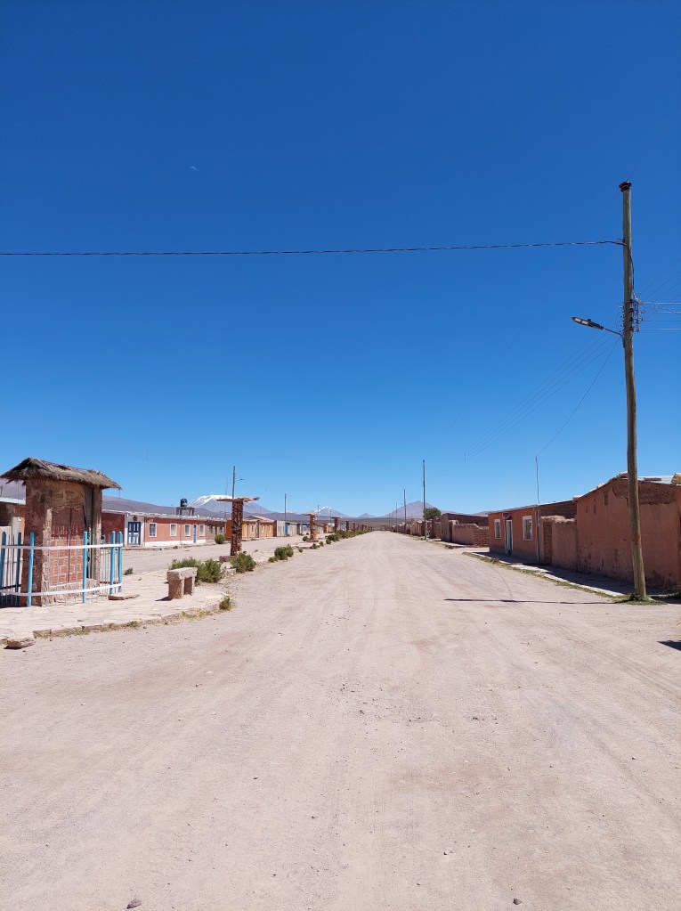 Wir verlassen die Stadt und bald wird klar, warum die meisten Menschen hier einen Geländewagen fahren. Asphaltierte Straßen gibt es kaum, meist ist der Untergrund Kies oder Sand. Nach rund zwei Stunden Fahrt haben wir unsere erste Station erreicht, es gibt Mittagessen. Dabei machen wir in einer Stadt halt, die wie ausgestorben wirkt. Die Sonne ist hier auf knapp 4000 Metern Seehöhe zu Mittag äußerst stark, weshalb man niemanden auf der Straße findet.