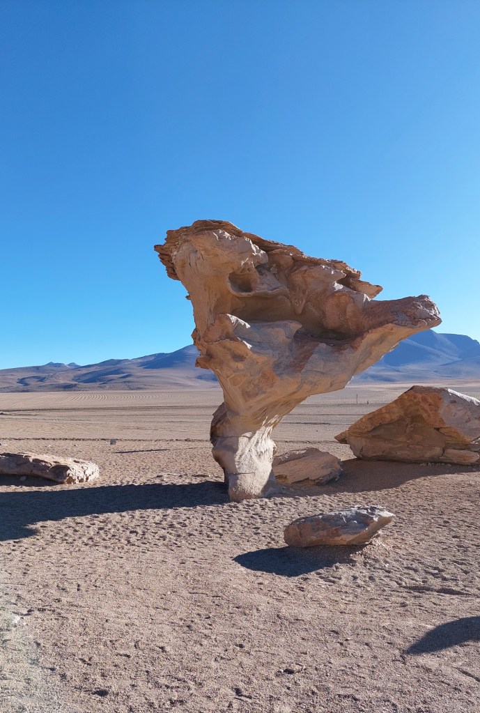 Weiter geht es durch eine Landschaft, die mich sehr an die Atacama Wüste erinnert. Das ist auch nicht weiter verwunderlich, grenzt diese doch direkt an das Altiplano. Nach Lagune Nummer zwei stoppen sie an einem Felsen, der wie ein Baum ausnehen soll. Dort findet man auch eines der wenigen WCs in der Wüste, wobei natürlich ohne fließendes Wasser.