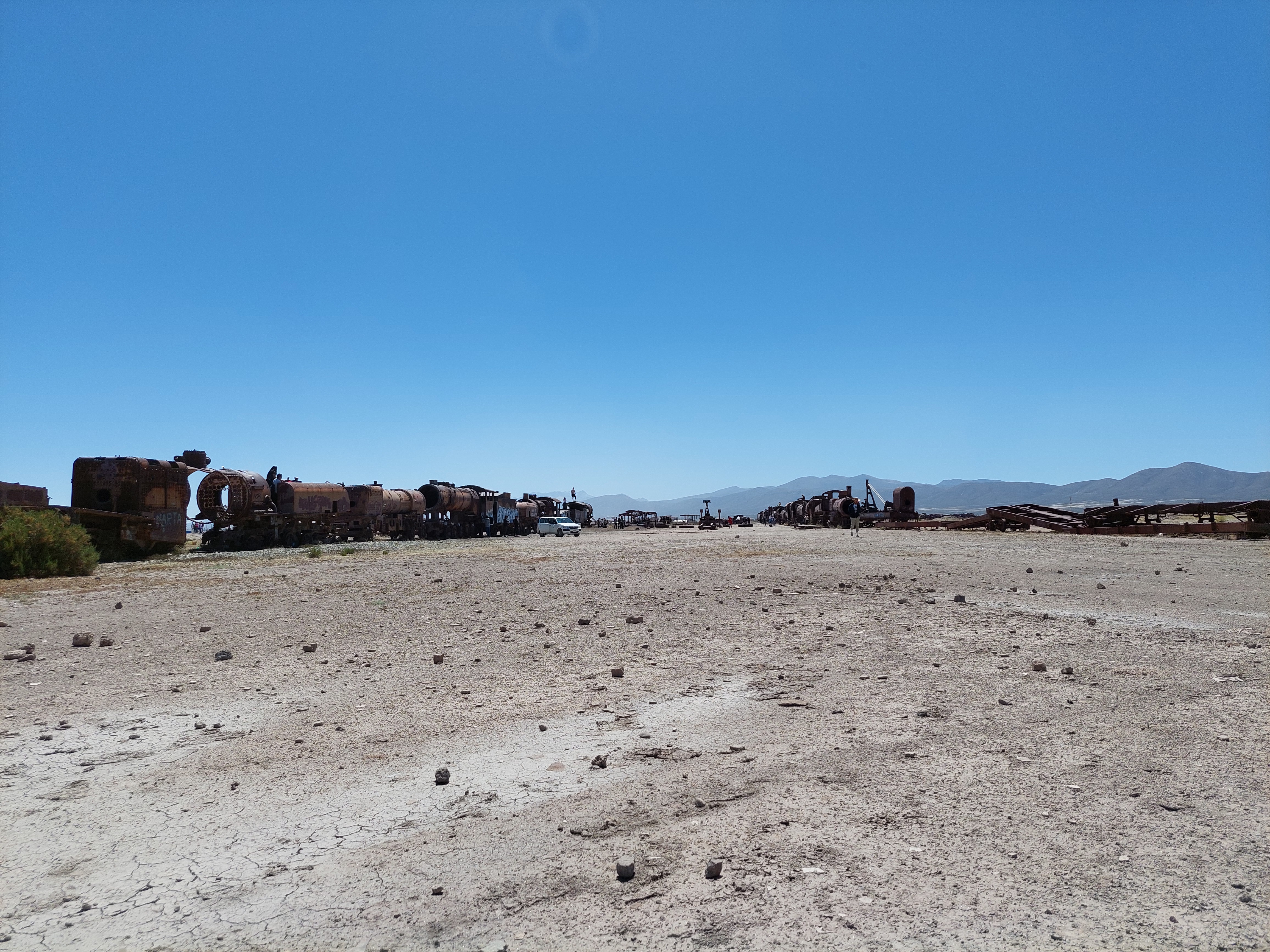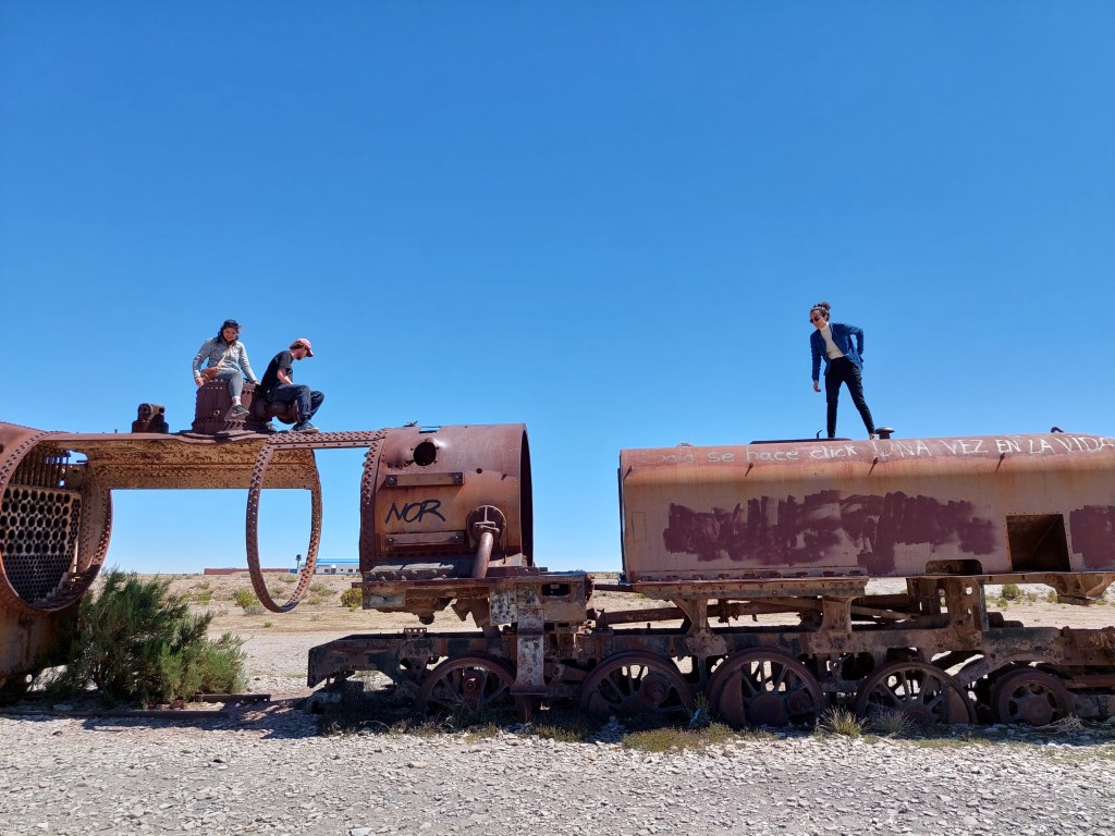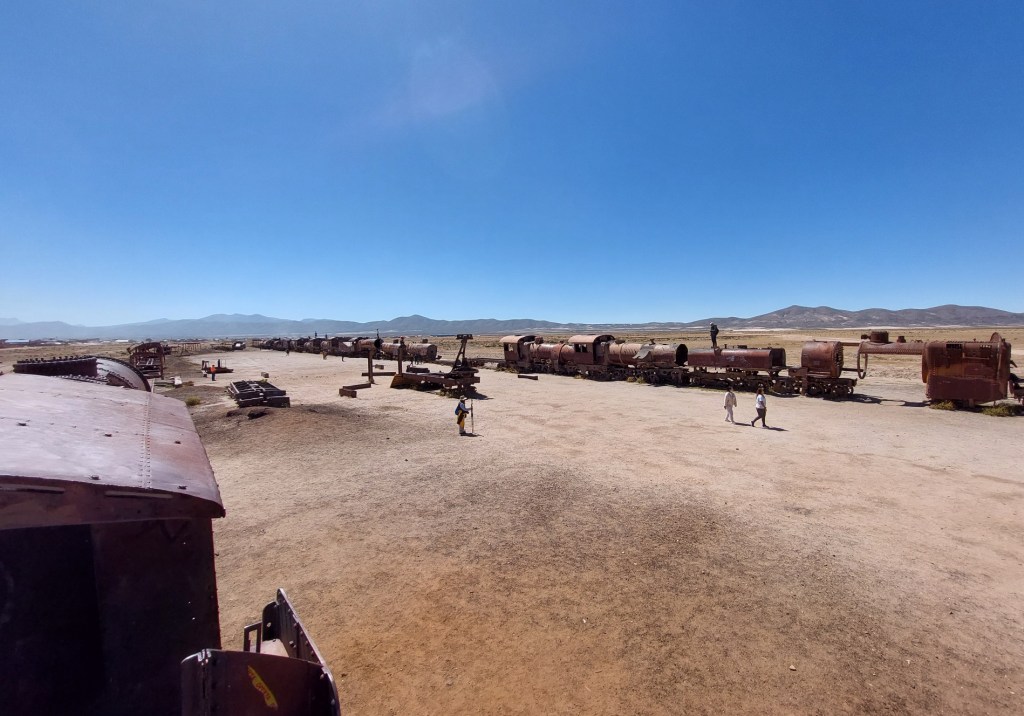 Bevor wir aber in die Salzwüste aufbrechen legen wir noch einen Stopp beim Zugfriedhof in Uyuni ein. Einst war Uyuni ein wichtiger Bahnhof um die Bodenschätze Boliviens in Richtung Pazifik zu bringen. Heute stehen hier nur mehr die ausgeschlachteten Skelette dutzender Züge und Triebwagen herum und rosten vor sich hin.