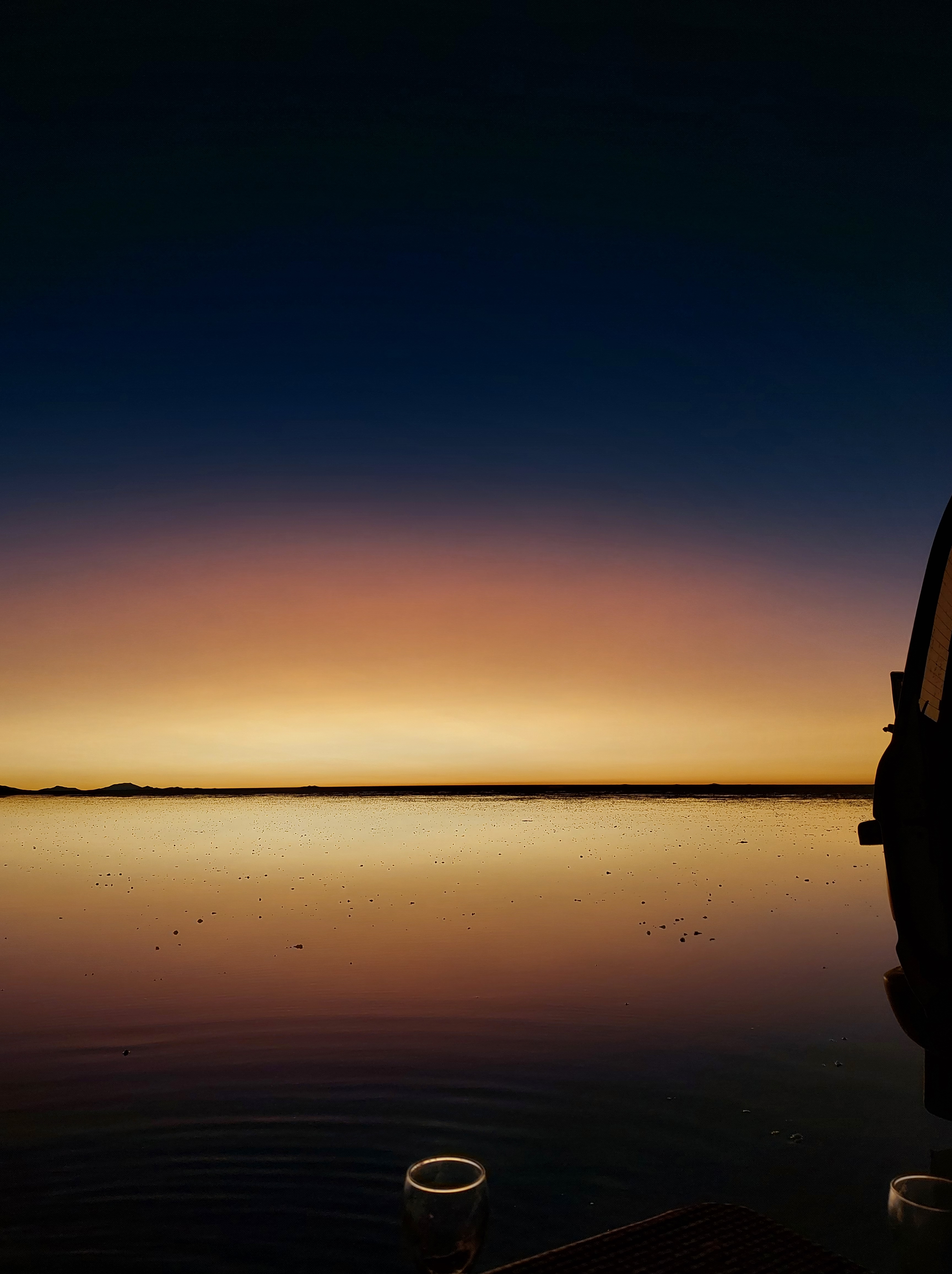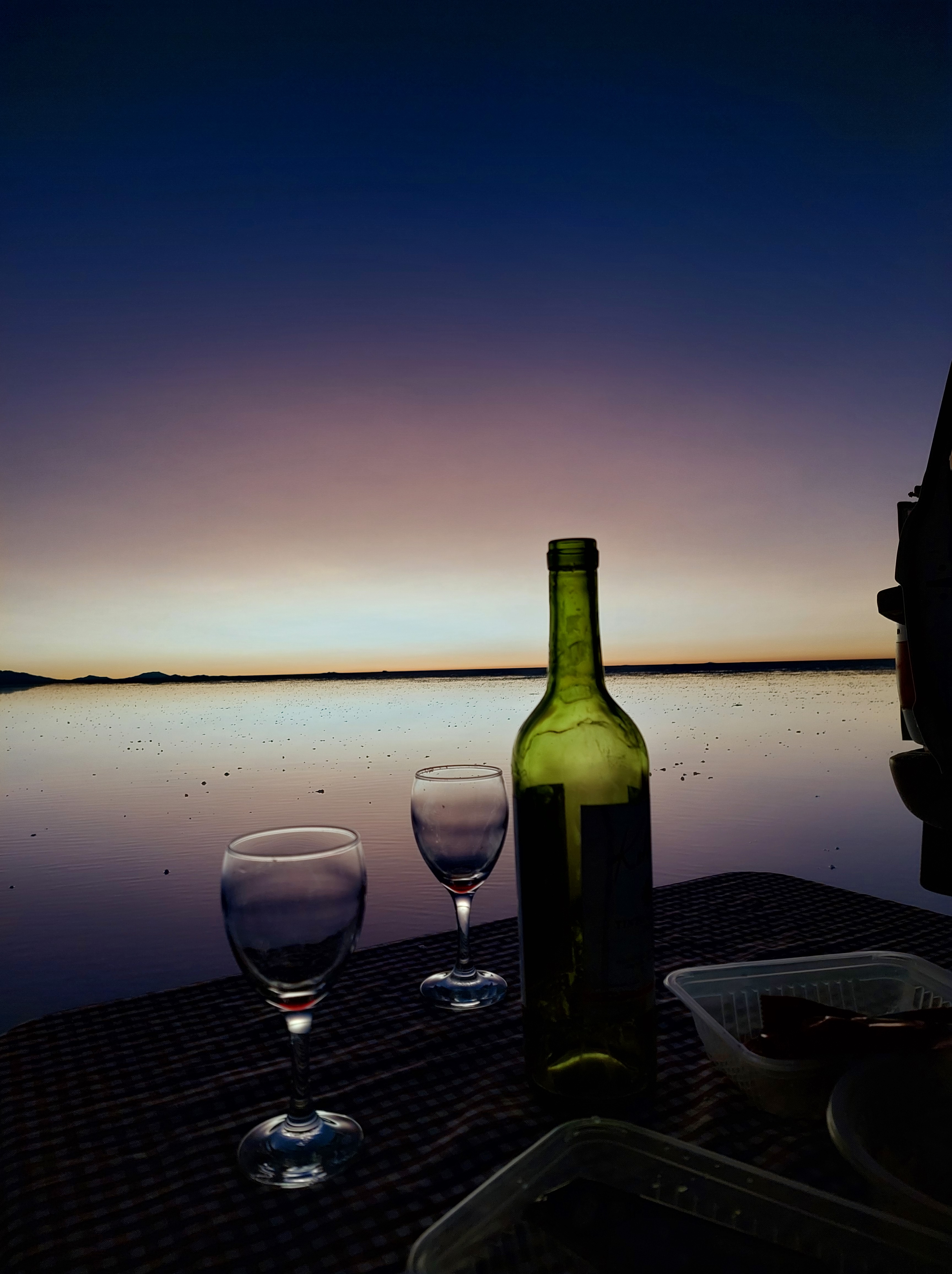 Zum Abschluss des Tages geht es noch an eine Stelle der Wüste, die gerade unter Wasser steht. Hier lässt sich der Spiegeleffekt in seiner vollen Pracht sehen. Also rein in die Gummistiefel und Fotos machen. Zum Abschluss gibt’s den Rest des Rotweins sowie ein paar Snacks.