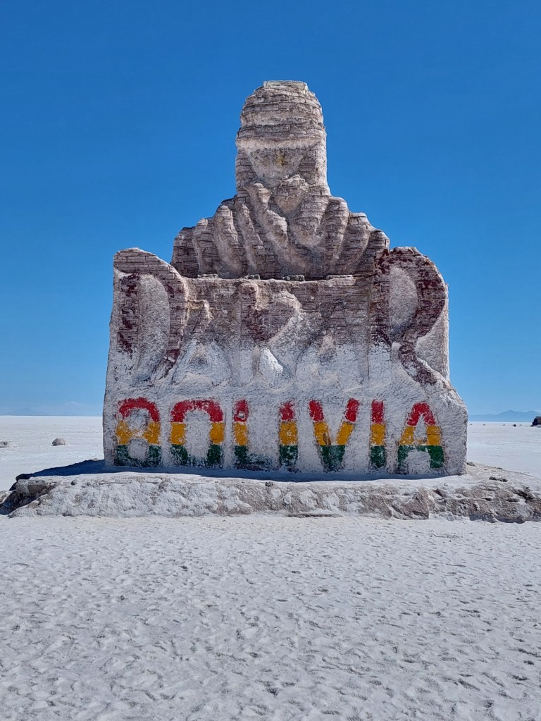 Nach rund 20 Minuten wird uns dann doch zu kalt, schnell abgetrocknet und es geht tiefer in die Salzwüste. Nächster Stopp ist ein ehemaliges Hotel – heute dürfen in der Wüste keine Hotels mehr betrieben werden. Wenige Meter daneben erinnert eine riesige Skulptur an die Rallye Dakar, die hier zwischen 2014 und 2018 durchführte. Auf der andern Seite des ehemaligen Hotels gibt’s einen Bereich, wo Besucher unzählige Flaggen montiert haben.