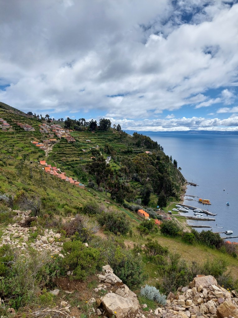 Dabei geht es das Boot sehr gemütlich an, entlang der Küste geht es der Insel entgegen. Eine gute Stunde dauert es, bis wir an einem Ende der Insel anlegen. Hier stehen die Ruinen des Sonnentempels und von hier aus startet eine kurze Wanderung bis ins Dorf Yumani. Zuerst geht es über einige Stufen hinauf, ehe der Weg langsamer bis auf fast 4000 Meter Seehöhe ansteigt.
