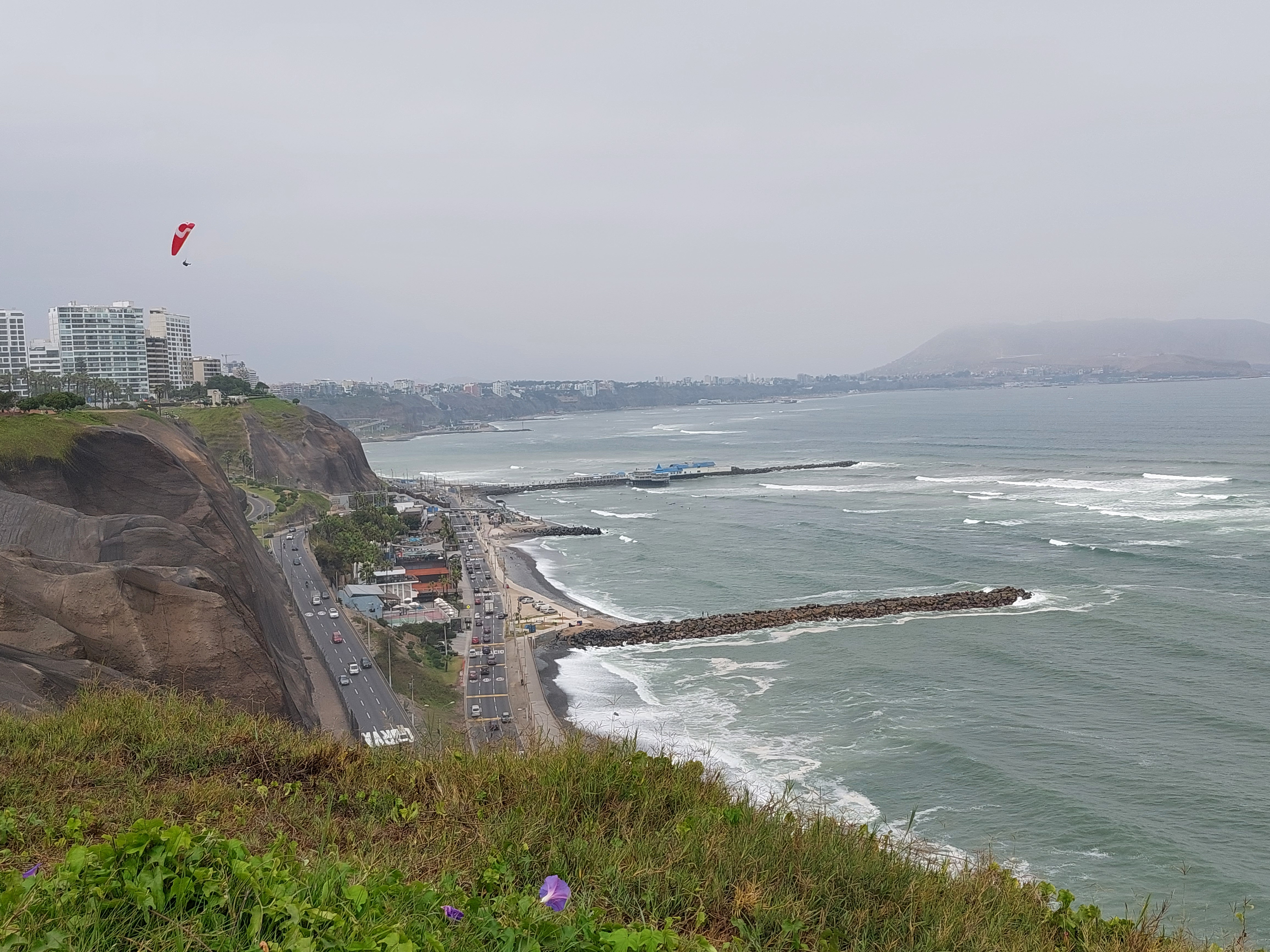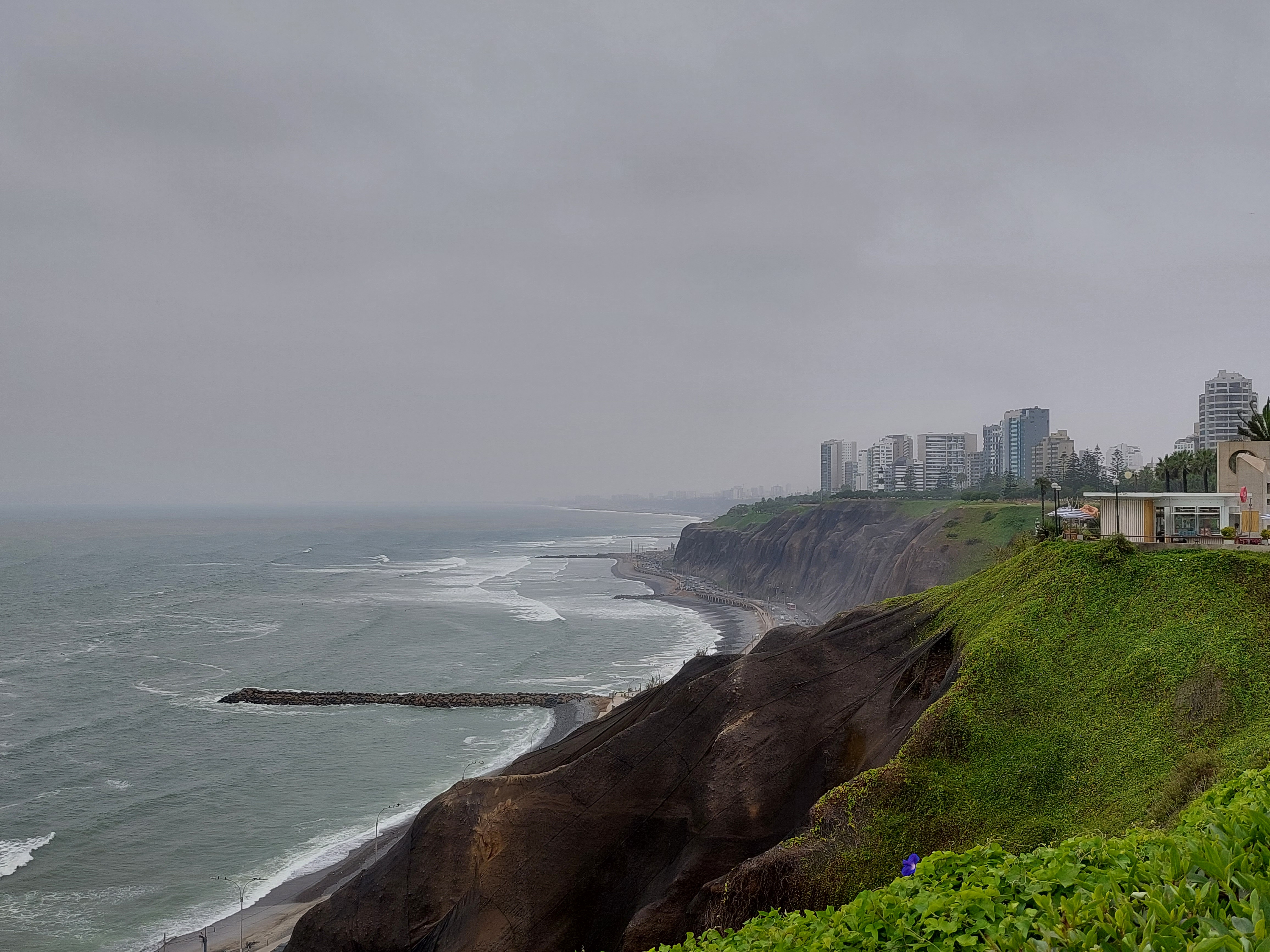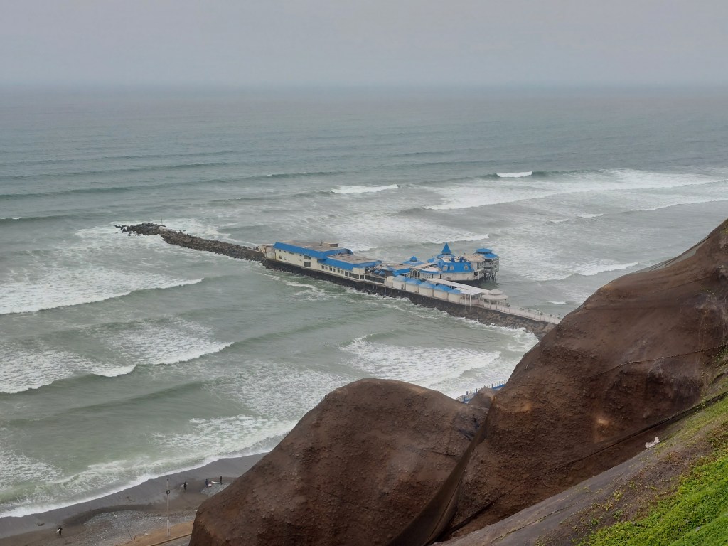 Ganz im Süden von Miraflores liegt die Pazifikküste. Diese fällt steil hin zum Strand ab. Dieser besteht nicht aus Sand sondern aus Schotter, kombiniert mit dem rauen Wasser kein guter Ort zum Baden. Ideal jedoch zum Surfen, wie die vielen Sportler im Wasser beweisen.