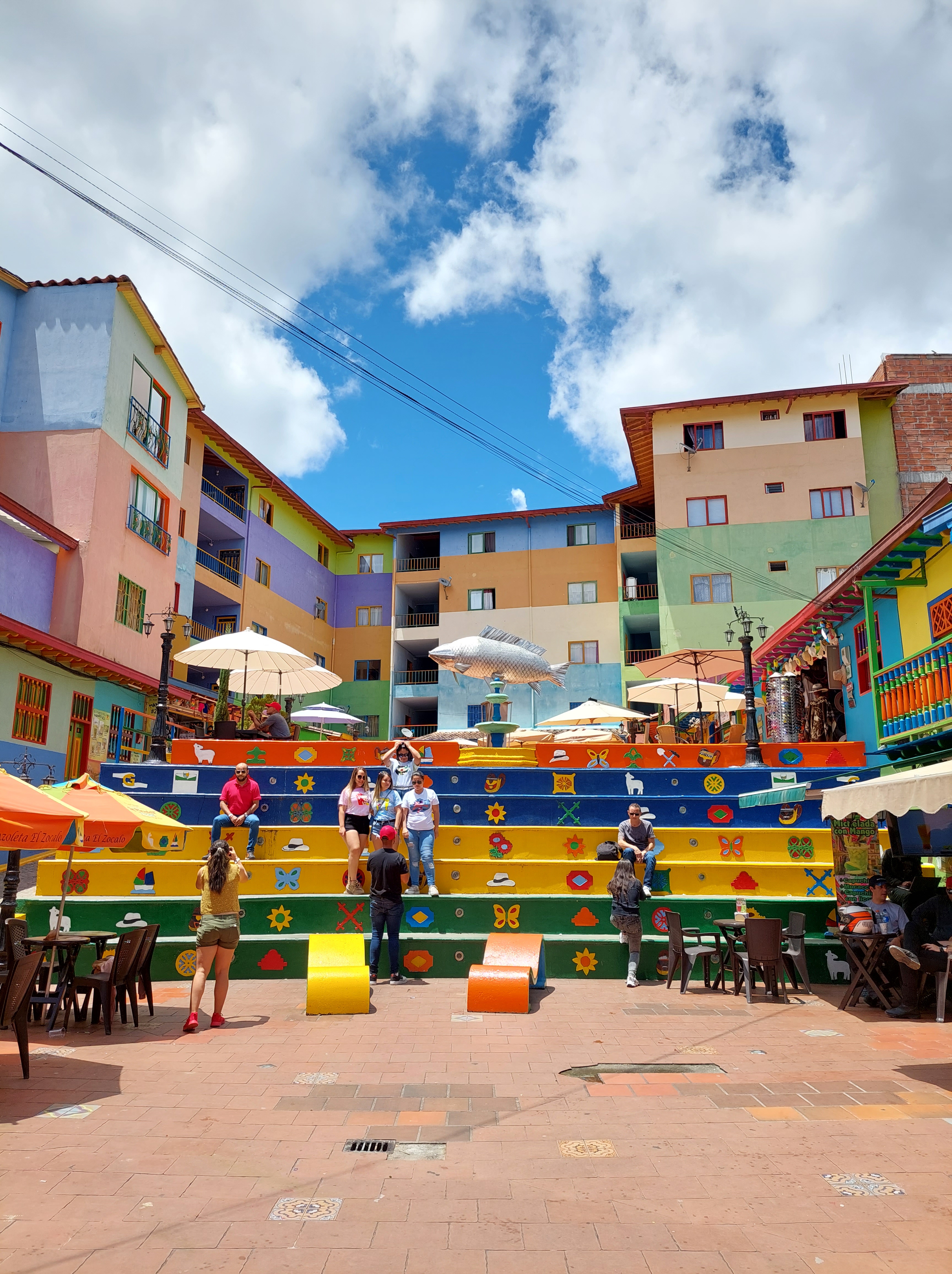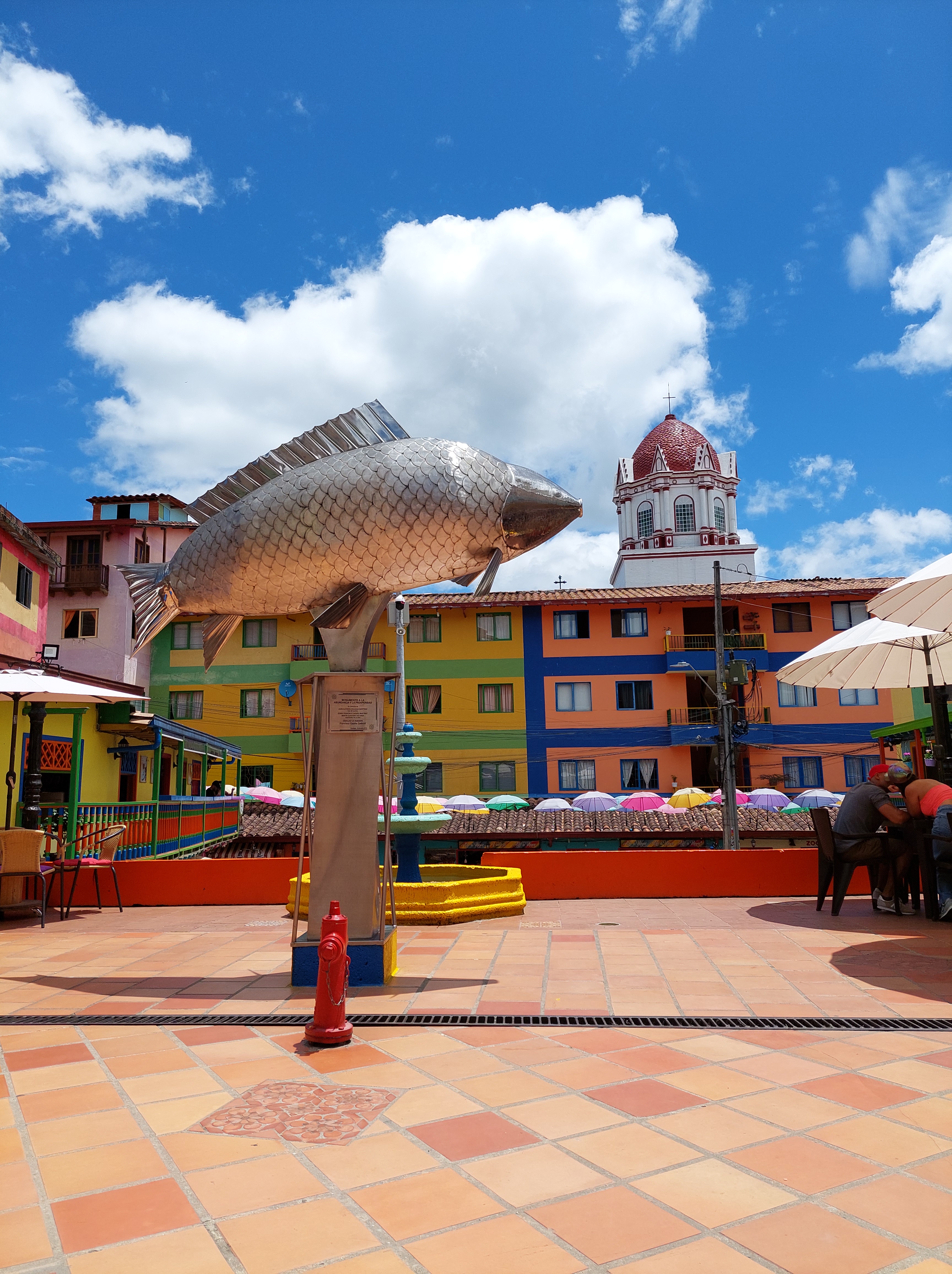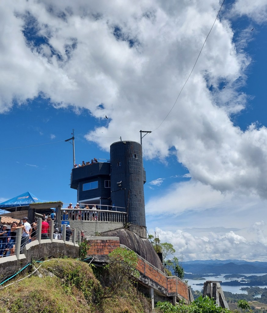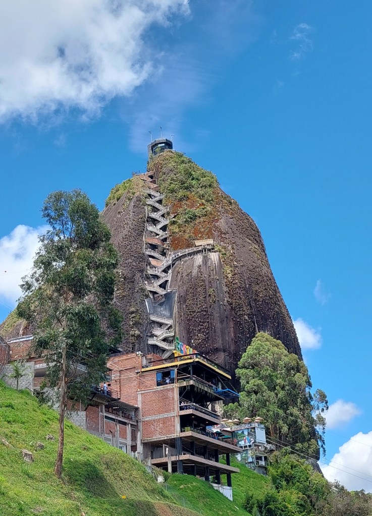 Frisch gestärkt geht es weiter nach El Peñol – oder besser gesagt Neu El Peñol. Die ursprüngliche Stadt wurde nämlich in den 70ern aufgegeben um an ihrer Stelle ein Wasserkraftwerk zu errichten. Rund 4000 Menschen wurden damals umgesiedelt. Wir stoppen kurz an einem Brunnen im Zentrum des Ortes bevor es zur Hauptattraktion des Tages geht – dem Piedra de Peñol.