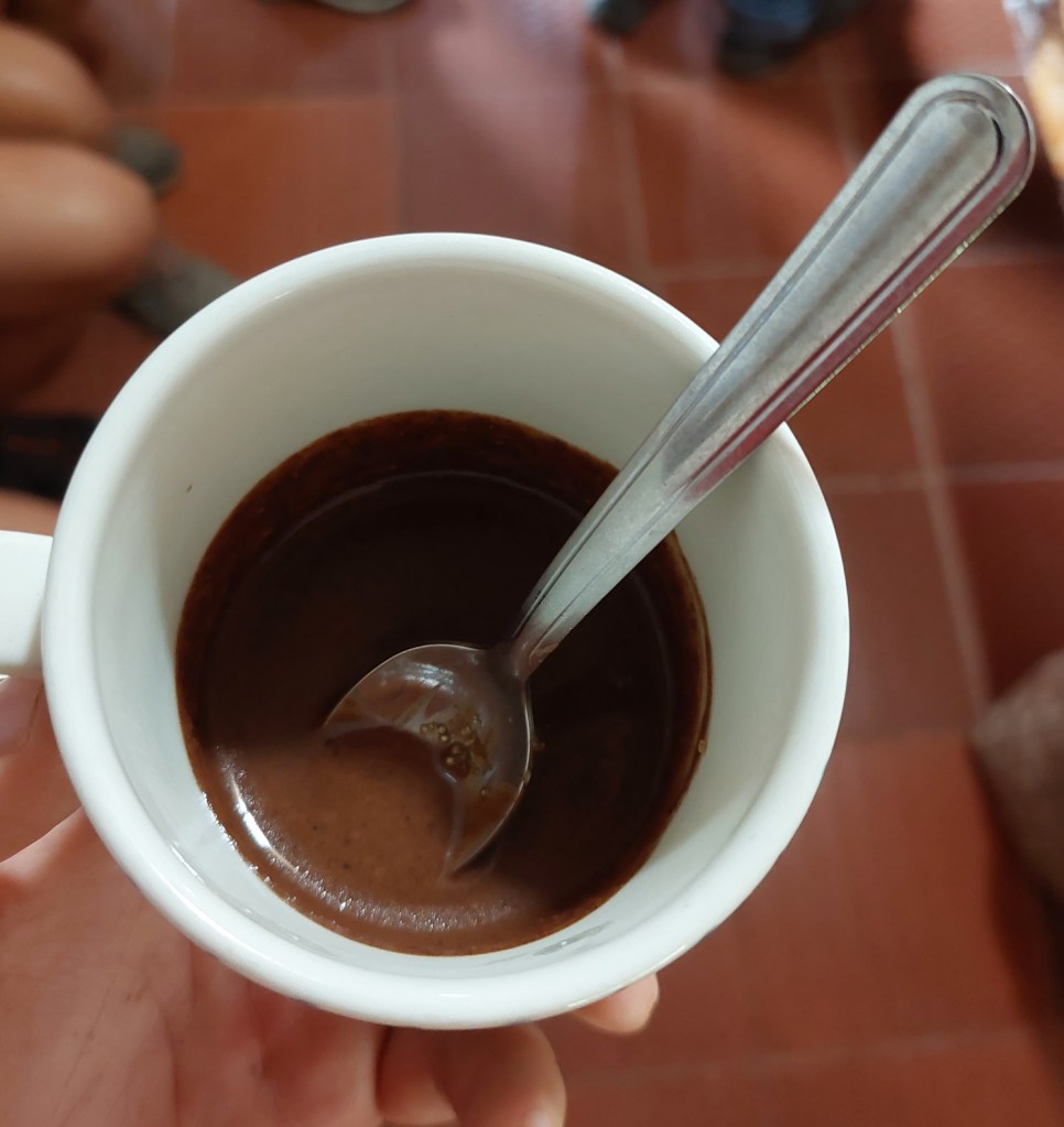 Während die Schale der Bohne als Brennstoff fürs Rösten verwendet werden kann, wird die Bohne selbst zu kleinen Kakaoflocken, den sogenannten Nibs, verarbeitet. Diese können wiederum gepresst werden, um Kakaobutter zu erhalten, oder gemahlen mit weiteren Zutaten zur Schokolade verarbeitet werden. Unser Guide, der Eigentümer des Familienbetriebes in dritter Generation, nutzt Honig anstelle von Zucker, um eine Schokoladenpaste zuzubereiten. Erwärmt man diese, wird die Schokolade flüssig.