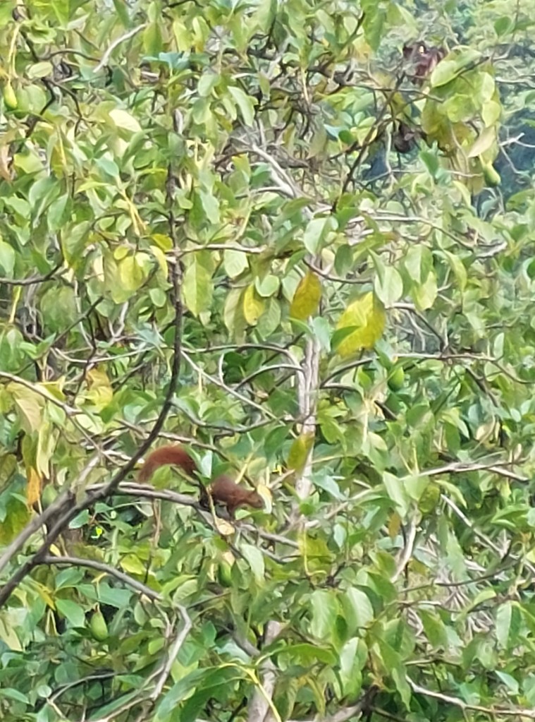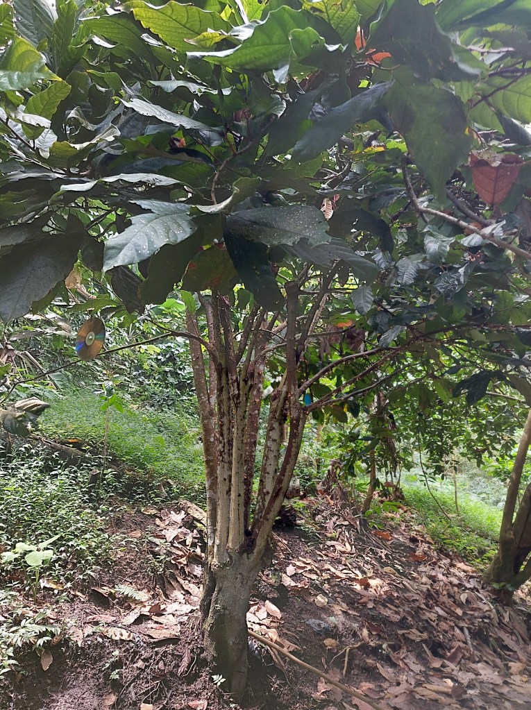 Schließlich kommen noch weitere Besucher und die Tour beginnt. Zuerst geht’s auf die Plantage selbst, wo neben Kakao auch Avocados, Mangos, Maracuja und andere Früchte angebaut werden. Der Grund dafür – um Eichhörnchen, Insekten, Vögel und Co. davon abzuhalten die Kakaobohnen zu fressen. Zusätzlich hängen in den Kronen der Kakaobäume auch CDs.