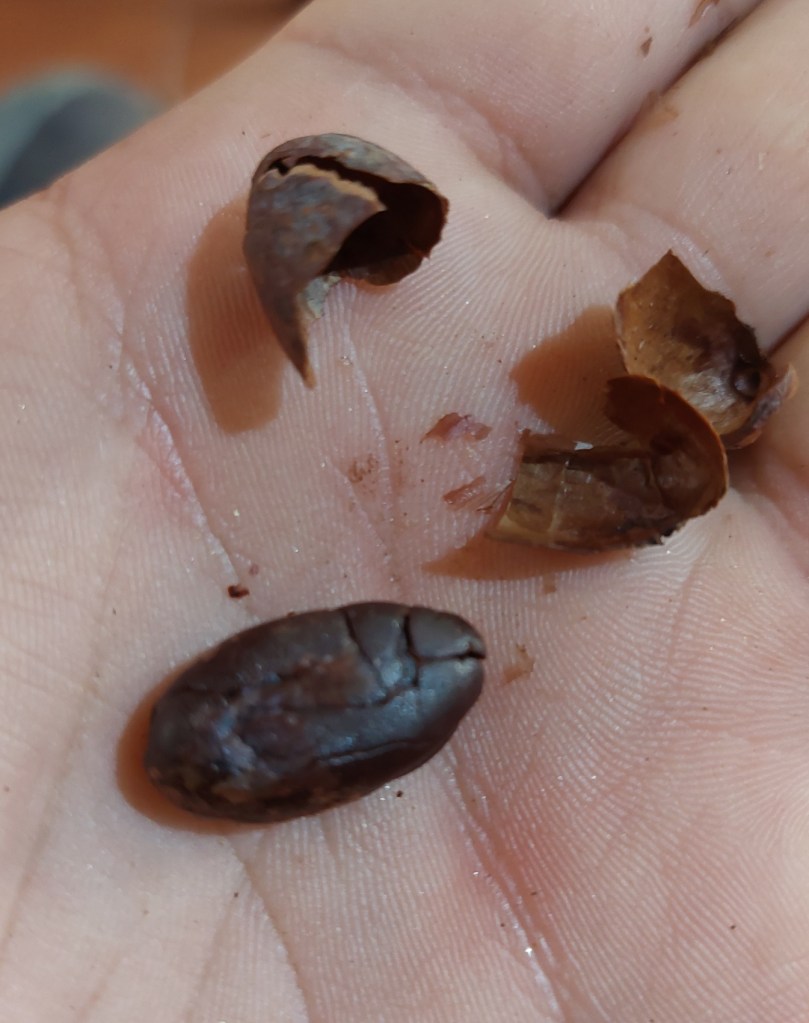 Zuerst wird die Frucht geöffnet. Neben dem Fruchtfleisch befinden sich darin auch bis zu 60 weiße Samen – die Kakaobohnen. Diese werden getrocknet und geröstet, wodurch sie ihren Geschmack sowie die dunkle Farbe bekommen. Sie sind nun zum Verzehr geeignet, schmecken allerdings Recht bitter.