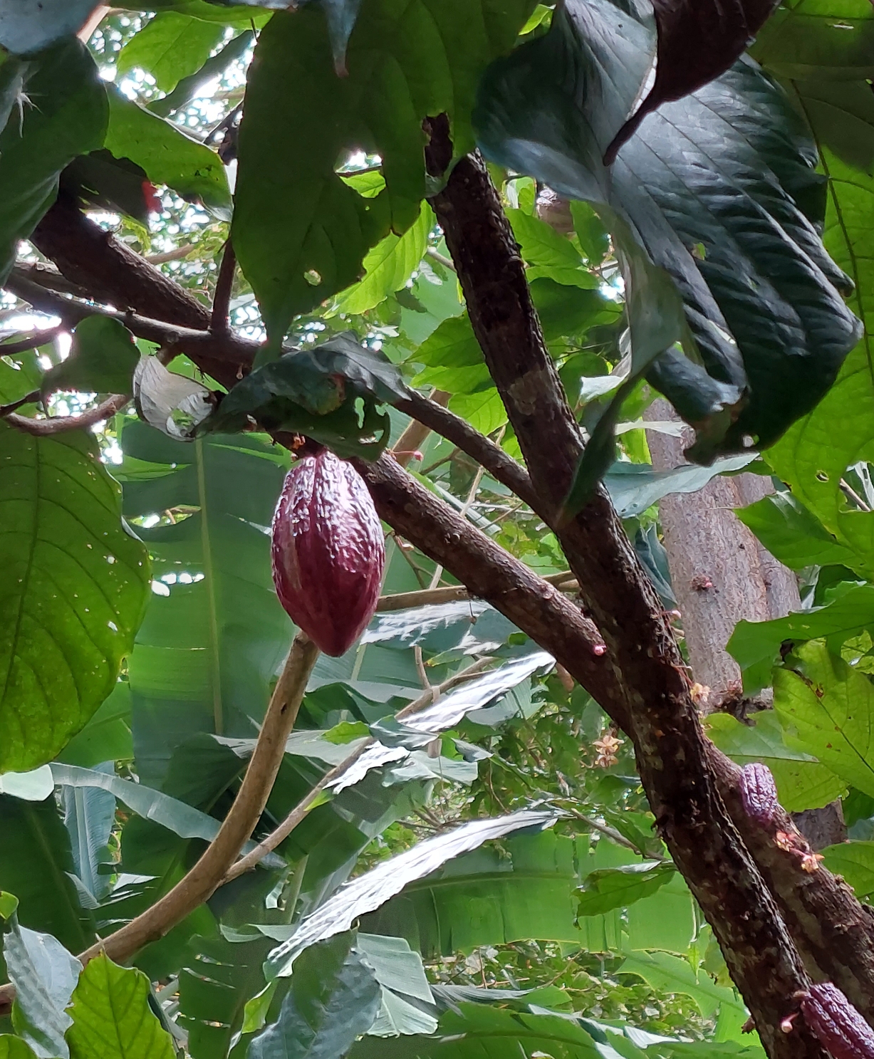 Schließlich kommen noch weitere Besucher und die Tour beginnt. Zuerst geht’s auf die Plantage selbst, wo neben Kakao auch Avocados, Mangos, Maracuja und andere Früchte angebaut werden. Der Grund dafür – um Eichhörnchen, Insekten, Vögel und Co. davon abzuhalten die Kakaobohnen zu fressen. Zusätzlich hängen in den Kronen der Kakaobäume auch CDs.