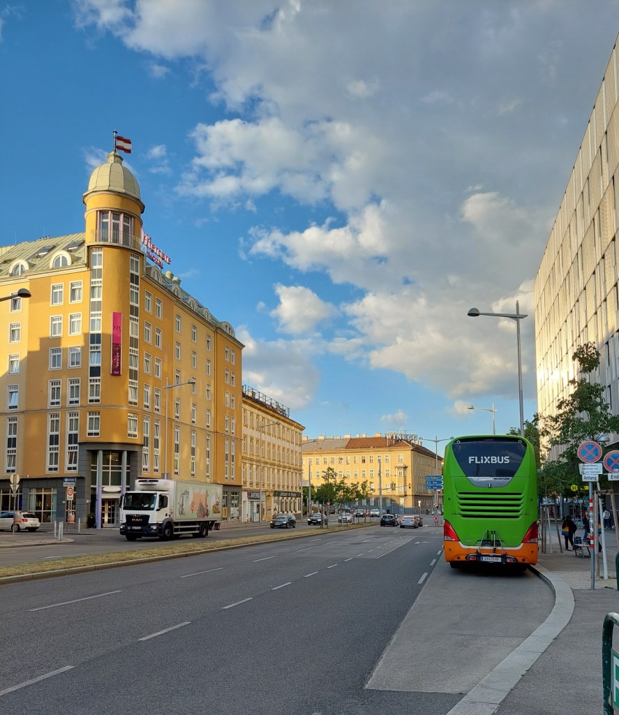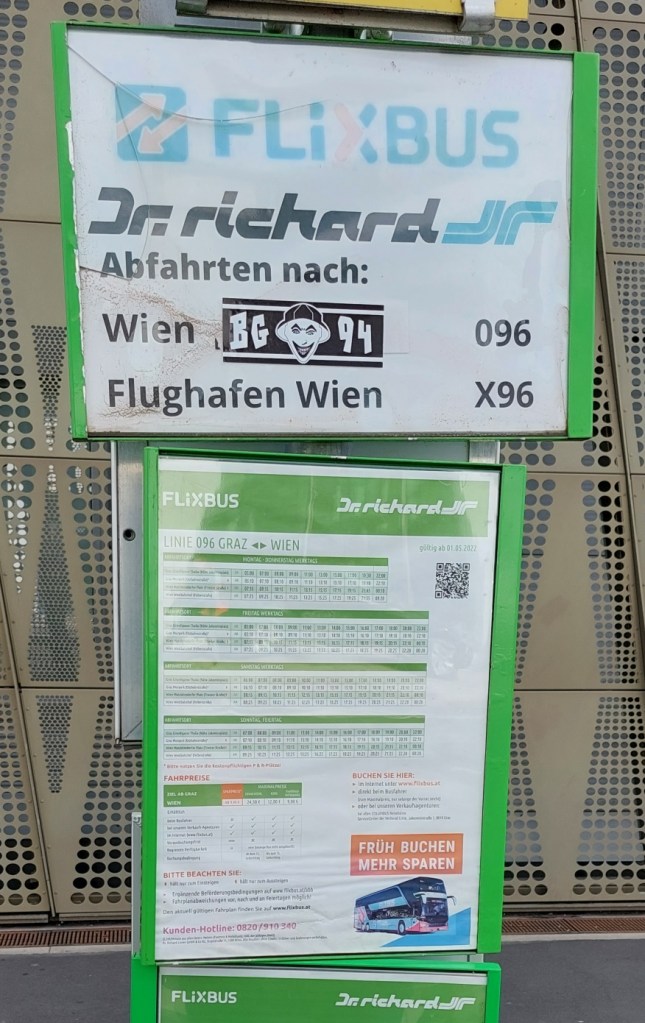 Bisher bin ich zu Konzerten in der Stadthalle immer mit dem Zug angereist und hab‘ dann in Wien übernachtet. Diesmal ist Wien aber gut gebucht, die Hotels sind ziemlich teuer. Hinzu kommt, dass die Busverbindung zwischen Graz und dem Wiener Westbahnhof ideal ist. Die Stadthalle liegt keine 10 Gehminuten vom Westbahnhof entfernt, der letzte Bus zurück nach Graz fährt um 23:30 ab. Noch dazu ist die Fahrt mit dem Bus auch günstiger als die Zugfahrt.