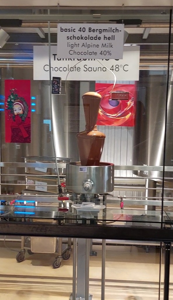 Von diesem Raum hat man auch einen Ausblick auf den essbaren Tiergarten, der bei schönem Wetter zum spazieren einlädt. Nach so viel Schokolade dringend notwendig. Innen geht es weiter in einen Raum mit Trinkschokolade, in welchem auch eine Mini-Seilbahn, die kleine Schokolade Glühbirnen transportiert, aufgebaut ist. Um die Geschmacksnerven zu beruhigen gibt es hier, wie auch im Rest der Räume, Wasserspender. Doch nach so viel Schokolade hilft auch das beste Wasser nicht mehr, zum Glück sind wir nun wirklich am Ende der Tour. Höchste Zeit um für etwas salziges.