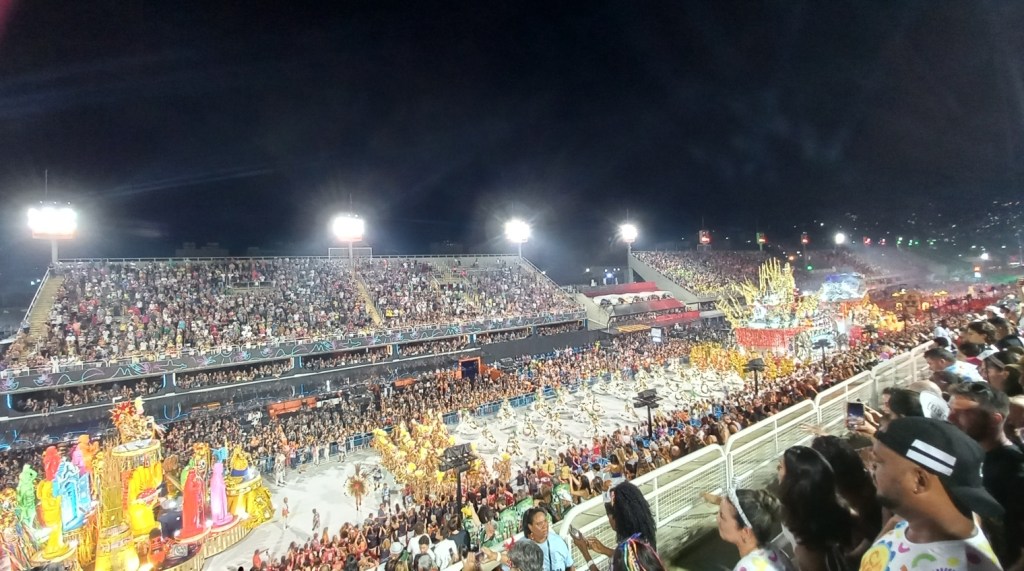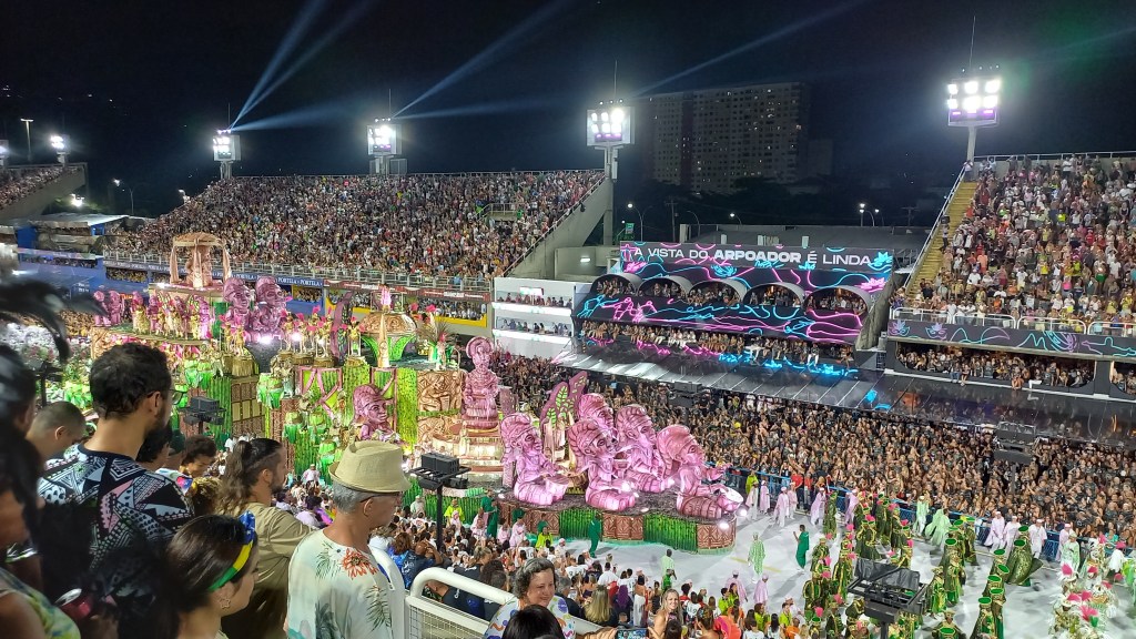 Bei dieser Siegerparade stehe auch ich auf der Tribüne und kann meinen Augen kaum glauben. Jede Sambaschule verwandelt die 700 Meter lange Arena für rund 65 Minuten in ein buntes Spektakel. Getanzt wird dabei auf riesigen, mehrstöckigen Wägen, die kunstvoll unterschiedlichen Themen gewidmet sind. Knapp 90.000 Menschen fasst das Sambadrom und egal ob im VIP Bereich oder auf den Tribünen, überall wird mitgetanzt. Und das obwohl es gegen Mitternacht immer noch 27 Grad hat.