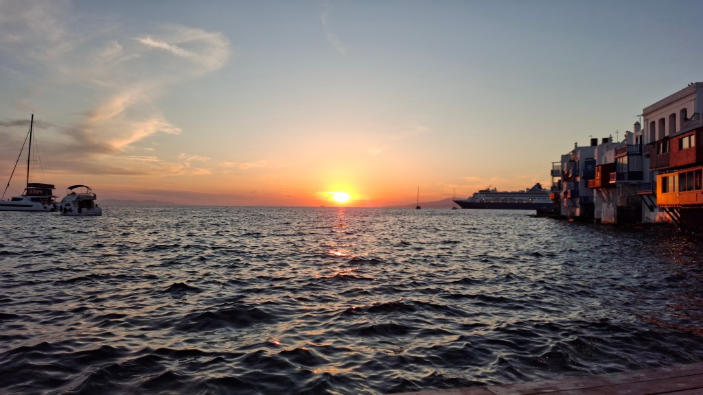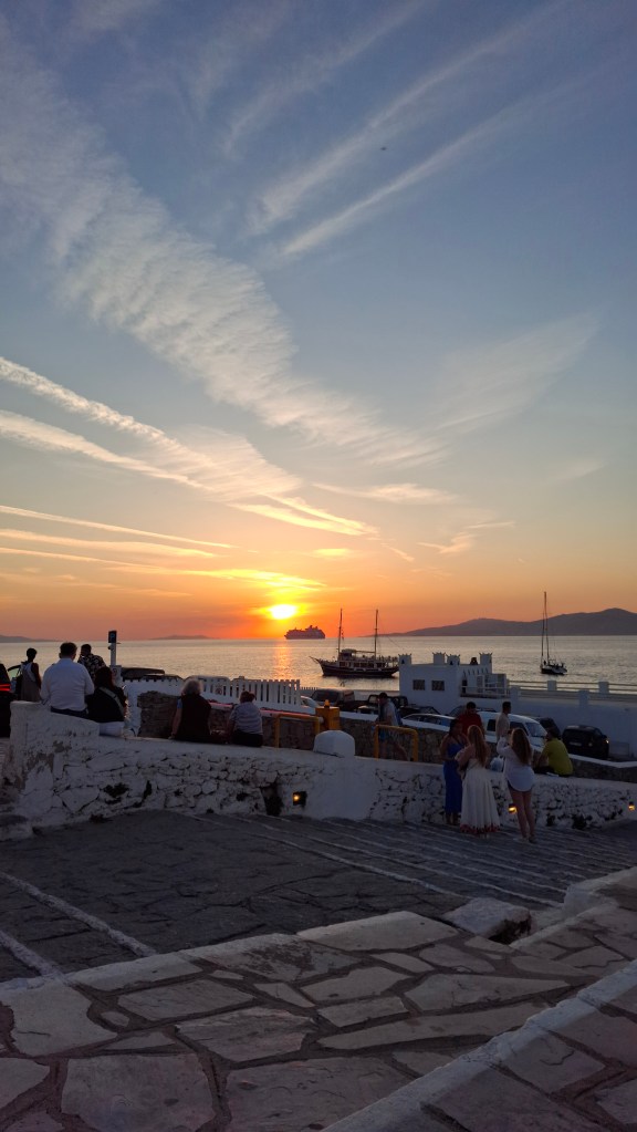 Zum Abschluss des Tages genießen wir nochmals den Sonnenuntergang. So geht unser letzter voller Tag auf Mykonos zu Ende, morgen geht es zur letzten Station unserer Reise weiter. Mehr dazu erfahrt ihr beim nächsten Mal.