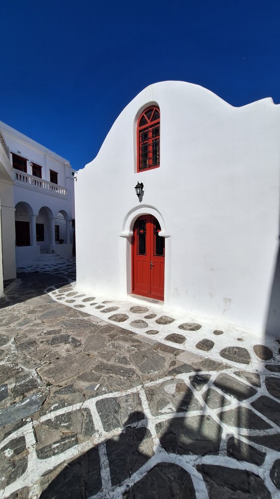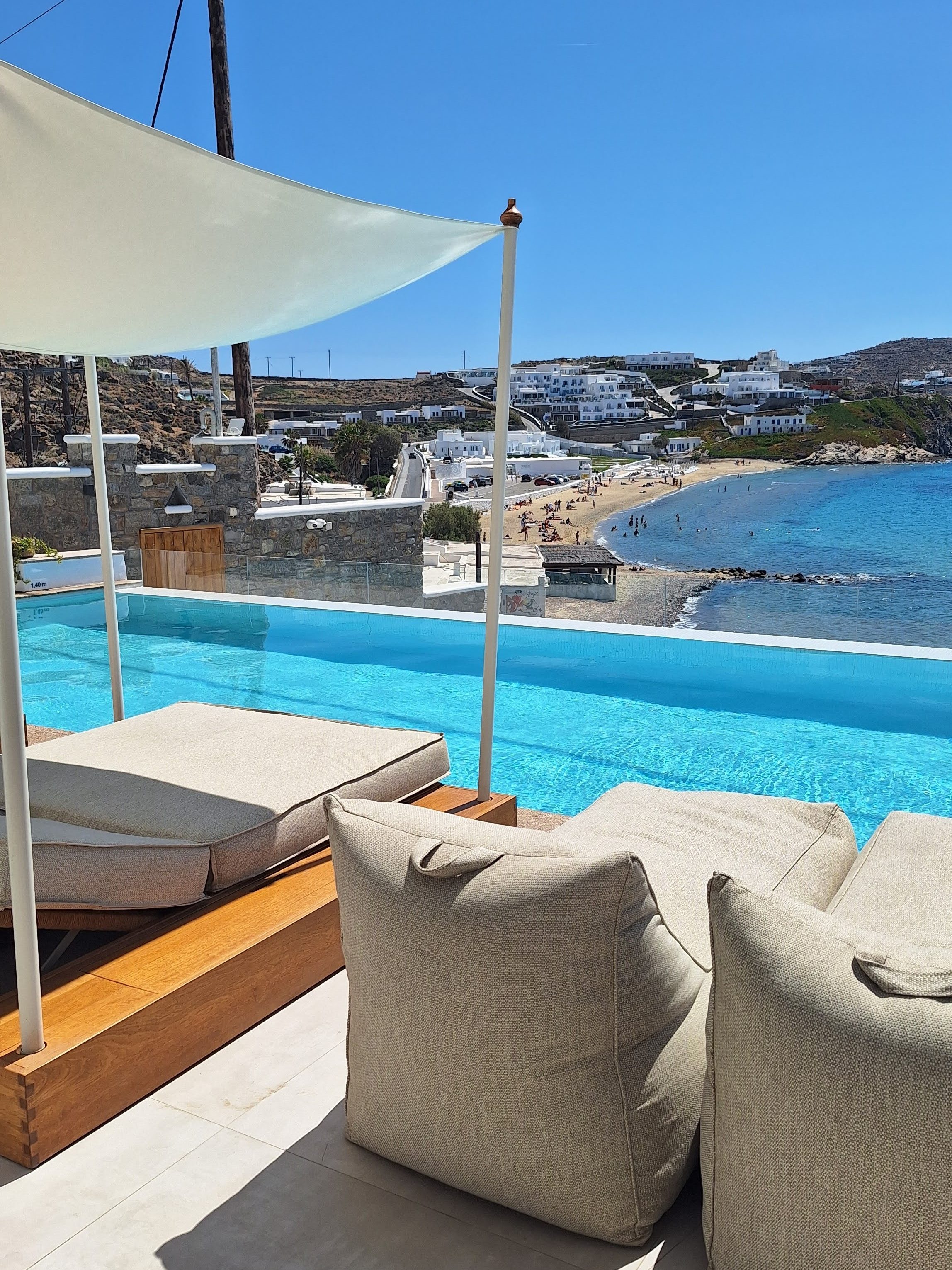 Wir entscheiden uns für den normalen Bus und sind damit schon nach wenigen Minuten im Zentrum von Mykonos. Unser Hotel liegt ein paar Minuten außerhalb in einem etwas ruhigeren Teil der Insel. Dafür können wir an einem tollen Pool mit wunderbarem Panorama entspannen.