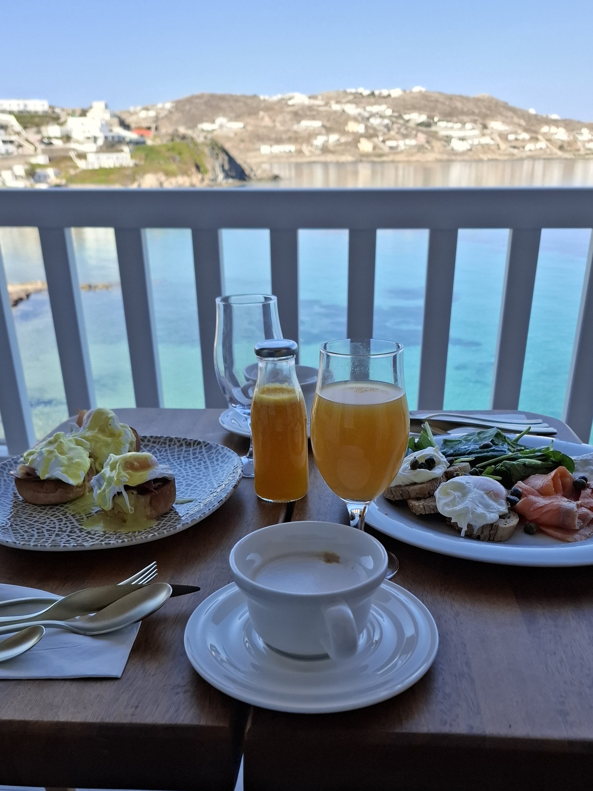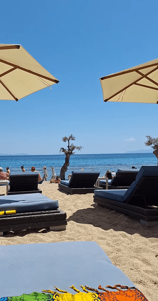 Danach geht es zu einem der unzähligen Beachclubs, für welche Mykonos bekannt ist. Dorthin kommen wir mit dem Bus vom Zentrum von Mykonos aus. Trotz früher Stunde ist schon einiges los. Da wir uns noch in der Vorsaison befinden ist der Eintritt frei, nur Liegen und Schirm sind zu bezahlen.