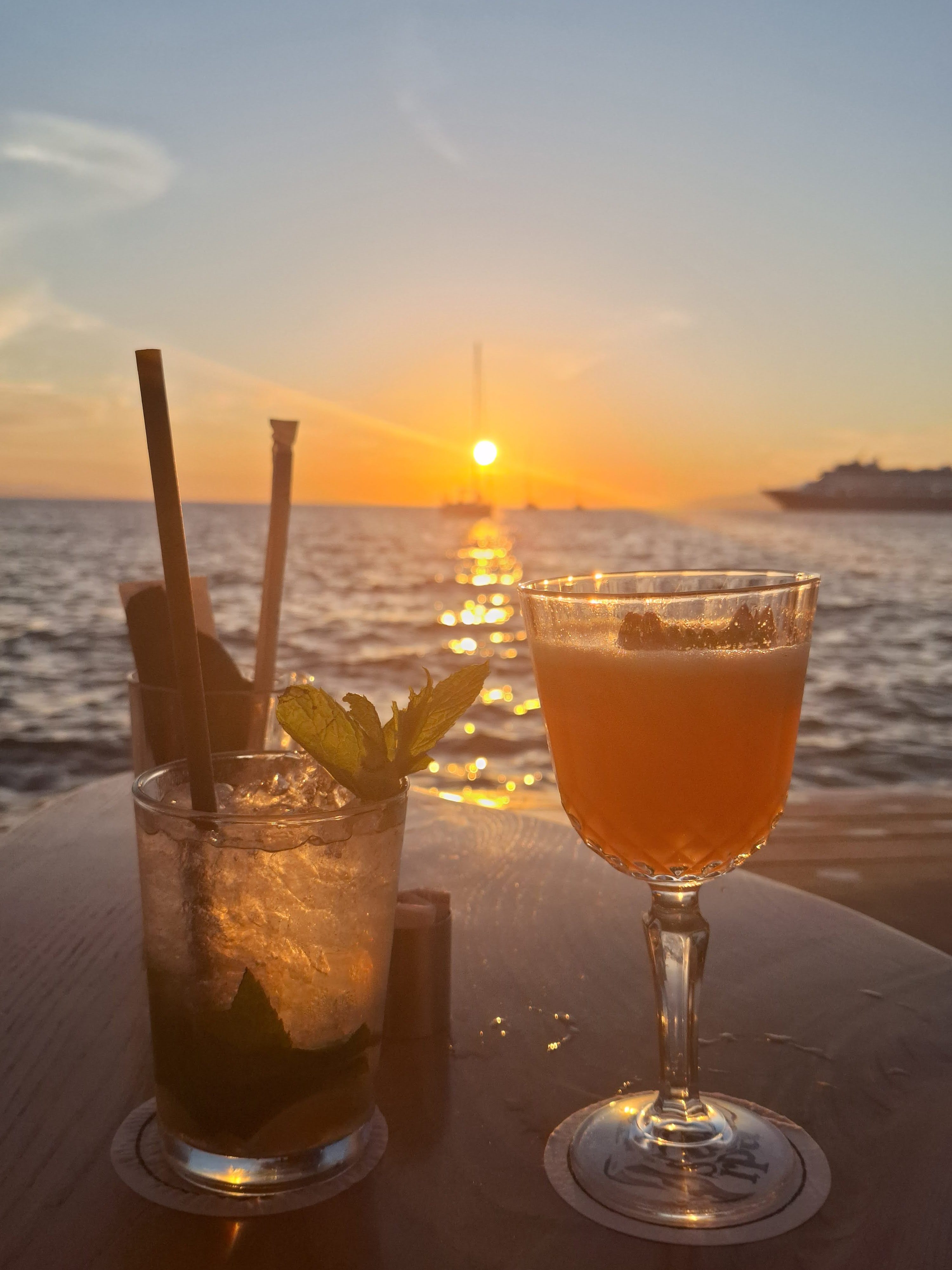 Erfrischt geht es ca. zehn Minuten zu Fuss zurück nach Mykonos. Wir wagen uns in das Labyrinth der Altstadt, auf der Suche nach einer Bar an der wir den Sonnenuntergang sehen können. Schließlich werden wir direkt am Meer fündig. Vor uns klatschen die Wellen ans Ufer, wärend wir bei einem Cocktail den Sonnenuntergang genießen.