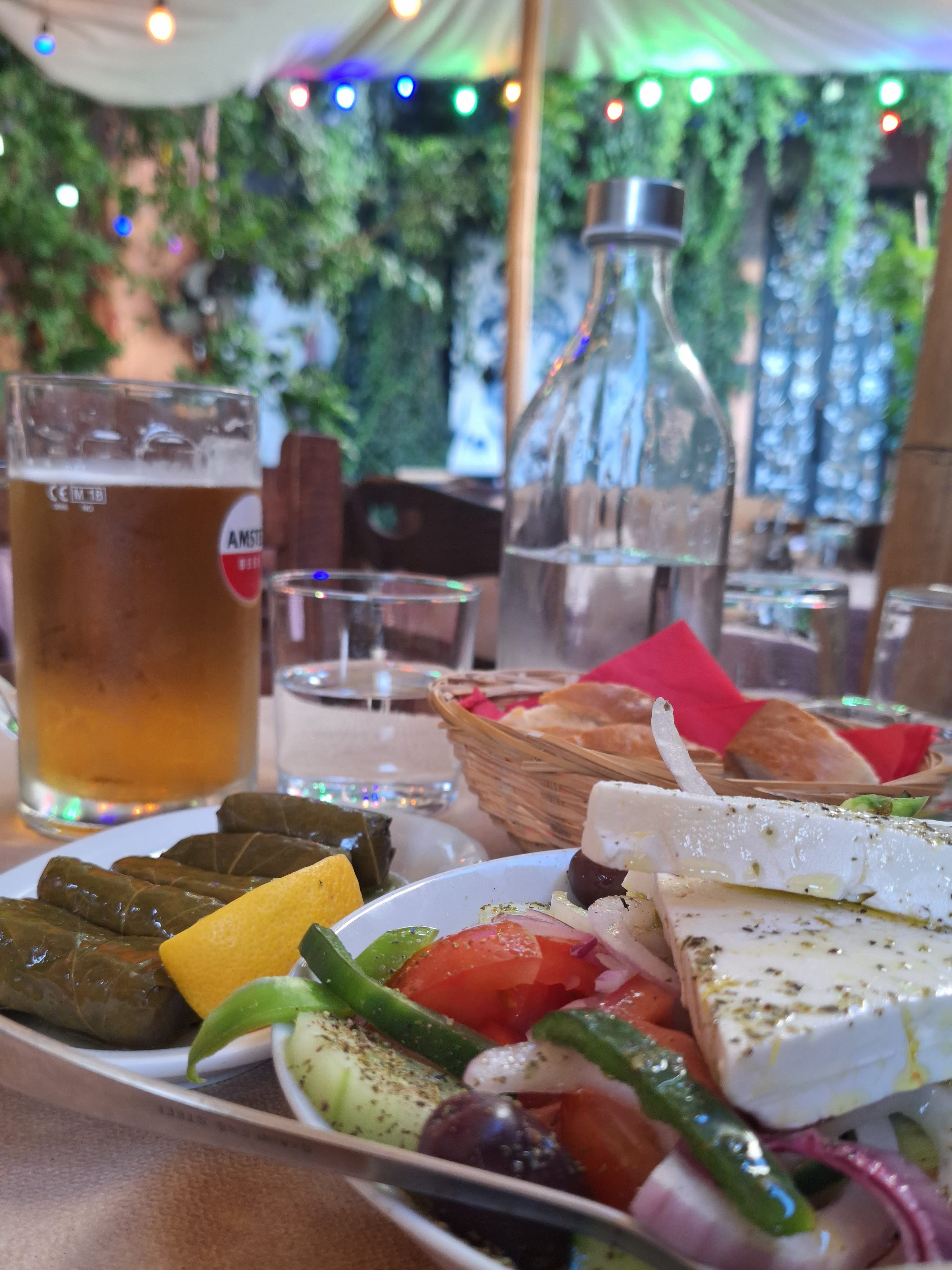 Zum Abendessen geht es in eine traditionelle Taverne, neben einem griechischen Salat probieren wir auch die gefüllten Weinblätter. Die Sonne geht unter und wir schlendern, am Fuße der Akropolis, noch ein wenig durch die Gassen.