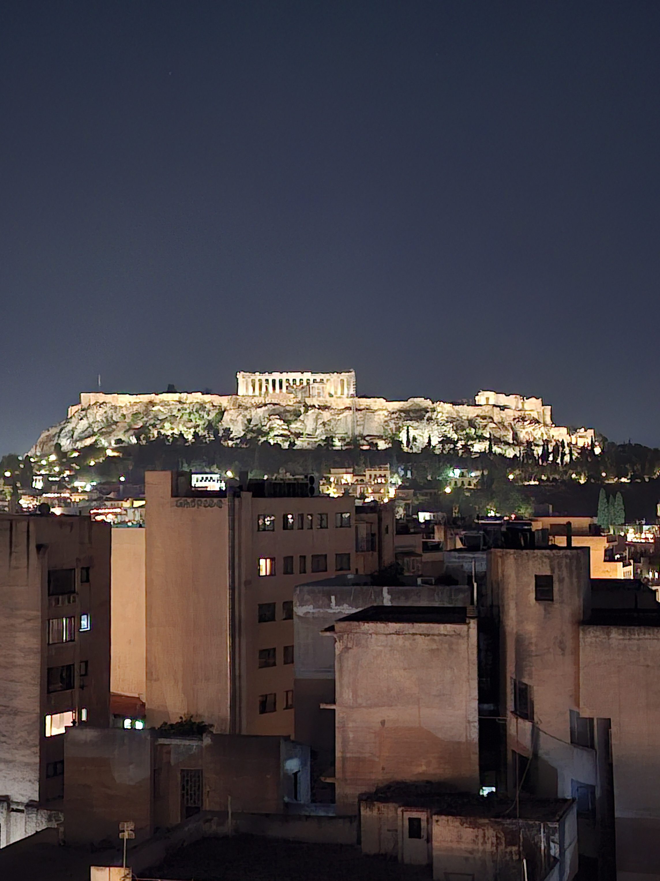 Zurück in unserem Hotel nutzen wir unsere Terrasse, um einen nächtlichen Blick auf das Wahrzeichen der Stadt zu werfen. Hoch über der Stadt thront die Akropolis, welcher wir am nächsten Tag einen Besuch abstatten werden.