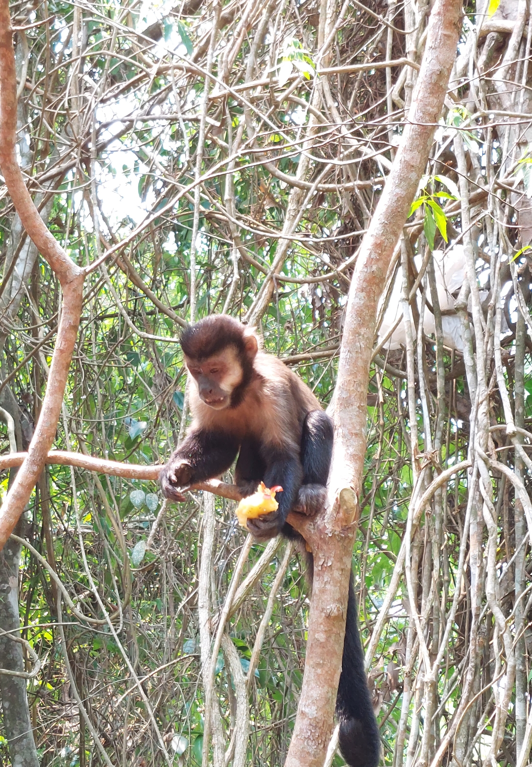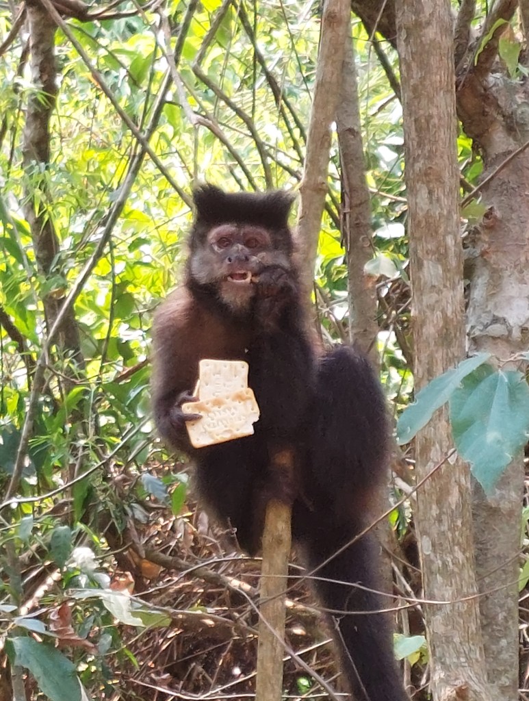 Nach einigen Metern gibt’s bereits einen Stau, eine Gruppe Kapuzineraffen hat den Besuchern ihr ihr Mittagessen abgeschnorrt. Der Park ist zwar mit Warnhinweisen zugepflastert die einheimischen Tiere nicht zu füttern, in dem Fall aber ohne Erfolg.