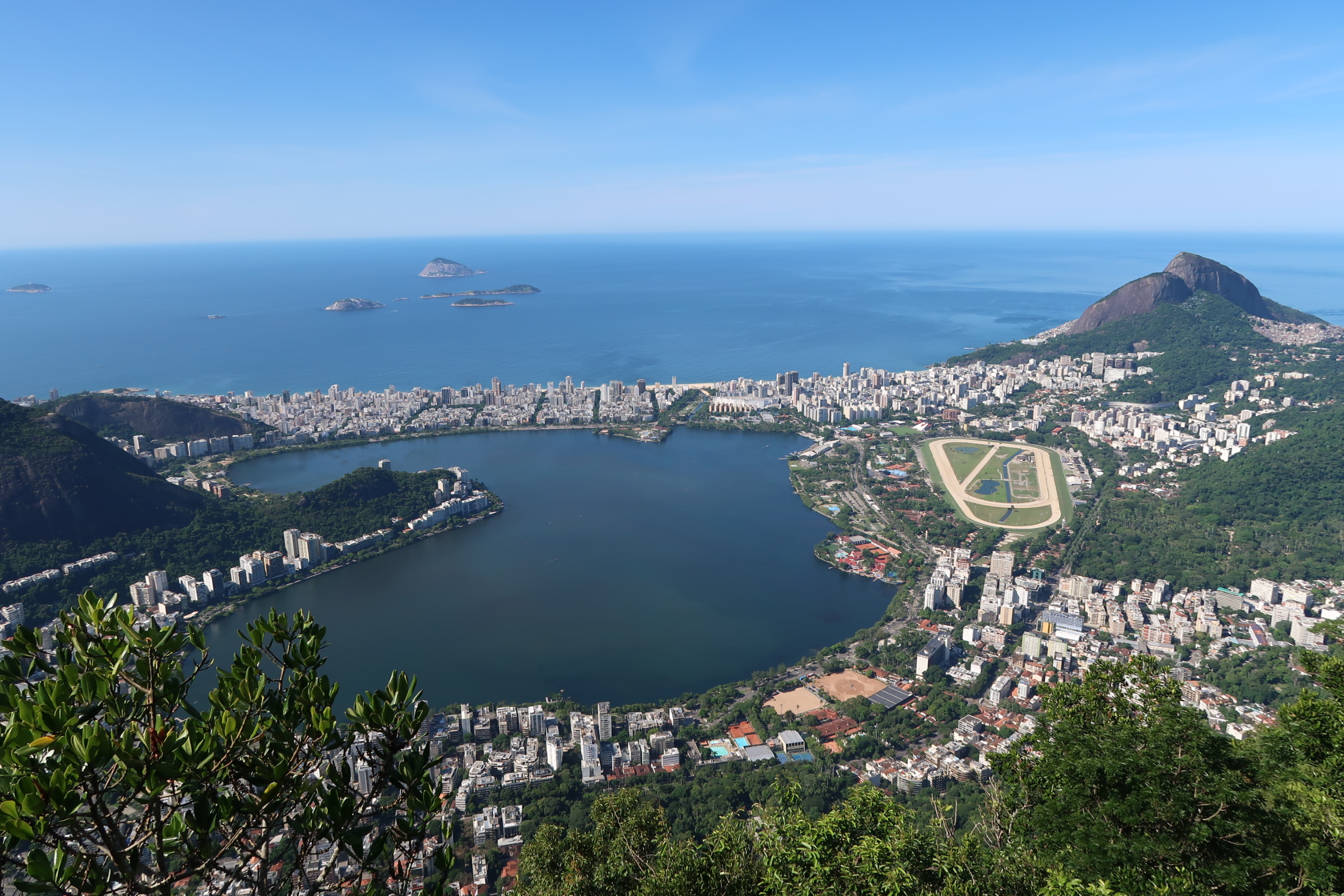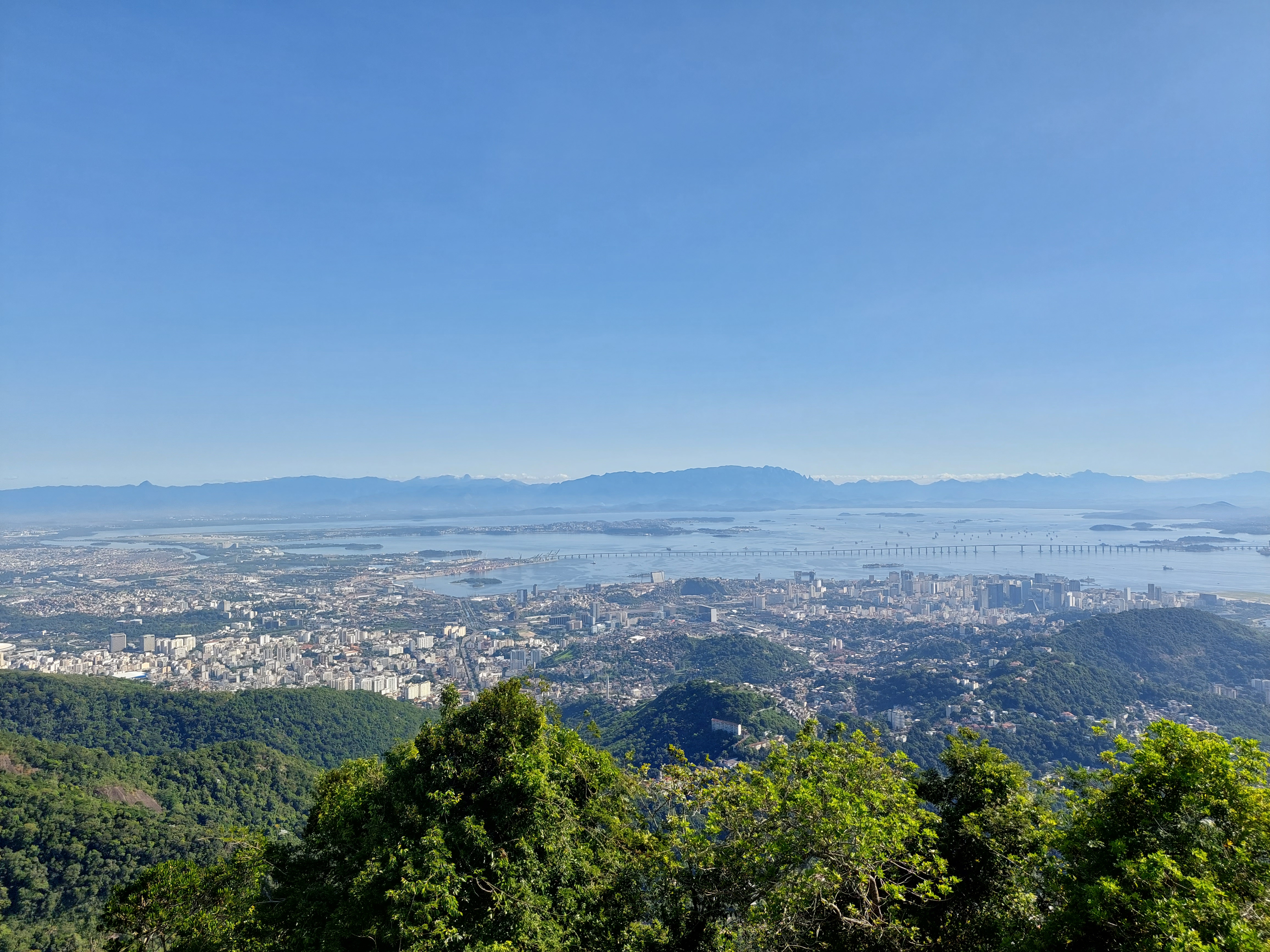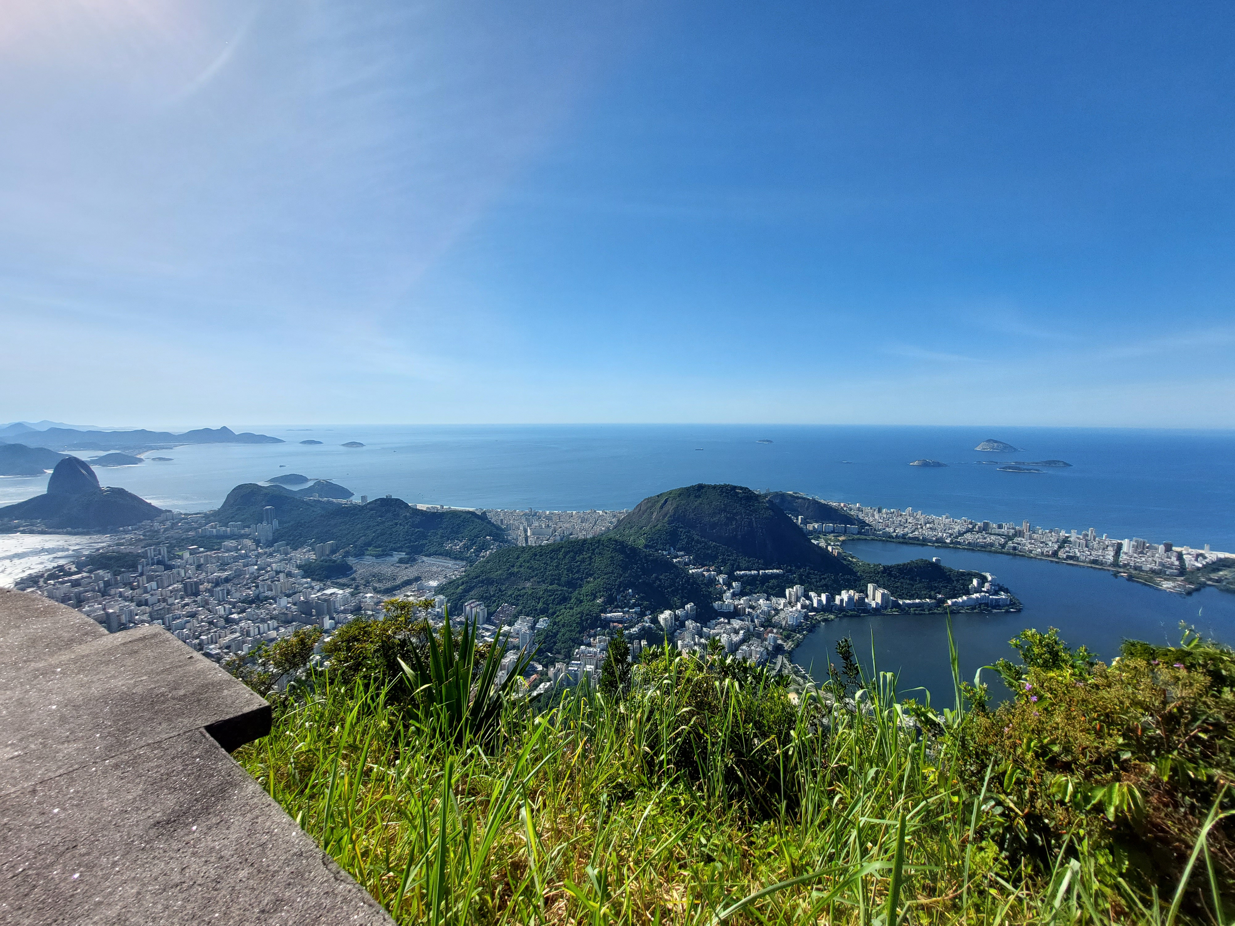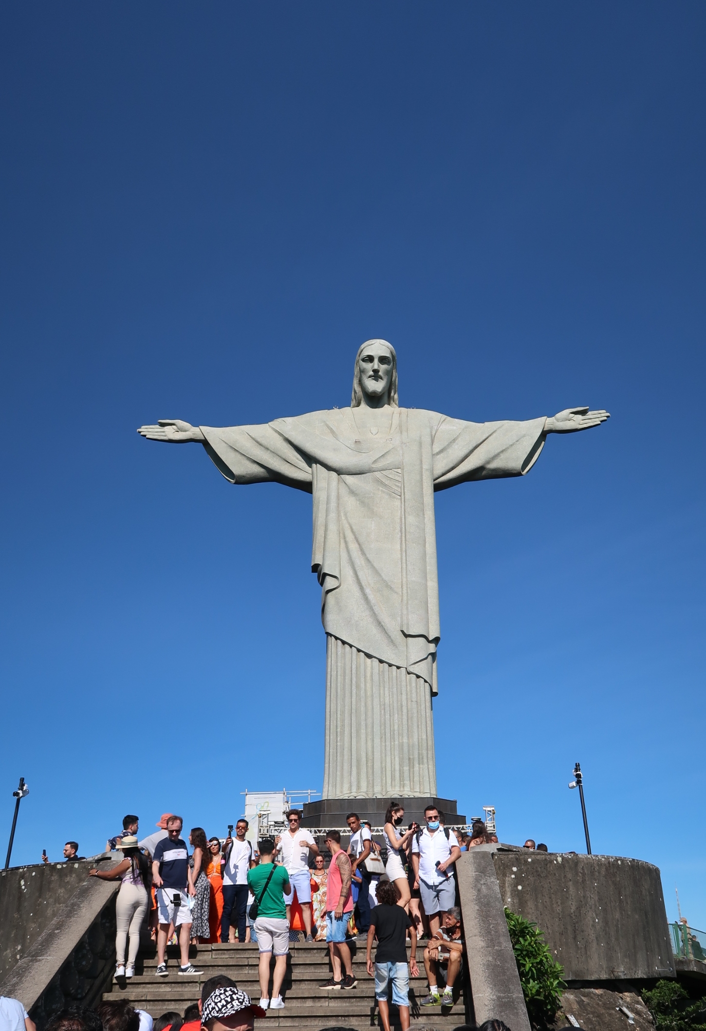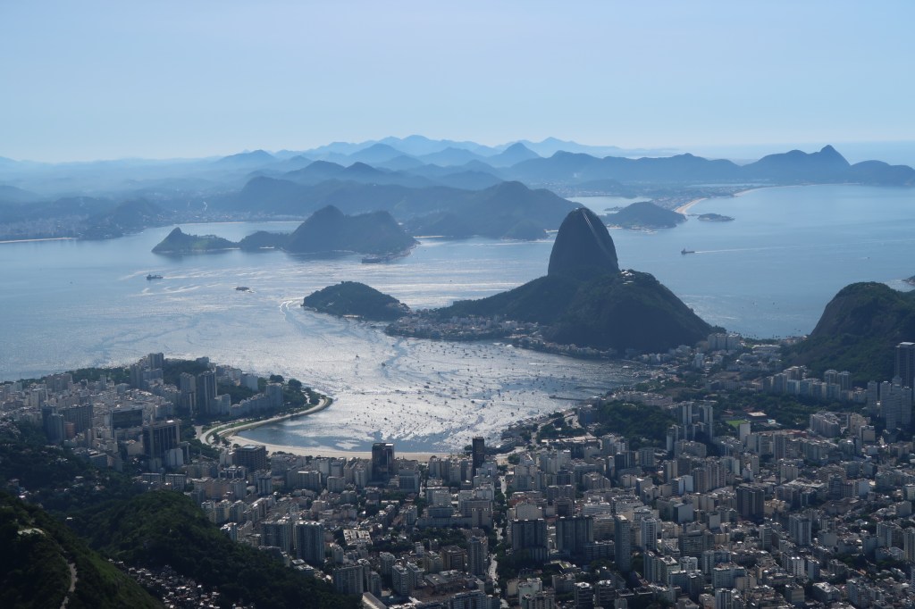 Blick auf den Zuckerhut hinab Zum Zeitpunkt meines Besuches findet gerade ein Gottesdienst statt, dementsprechend geht es dicht gedrängt her. Jeder möchte natürlich ein Selfie mit der Statue haben, hinzu kommt dass die Plattform am Gipfel nicht sehr groß ist.
