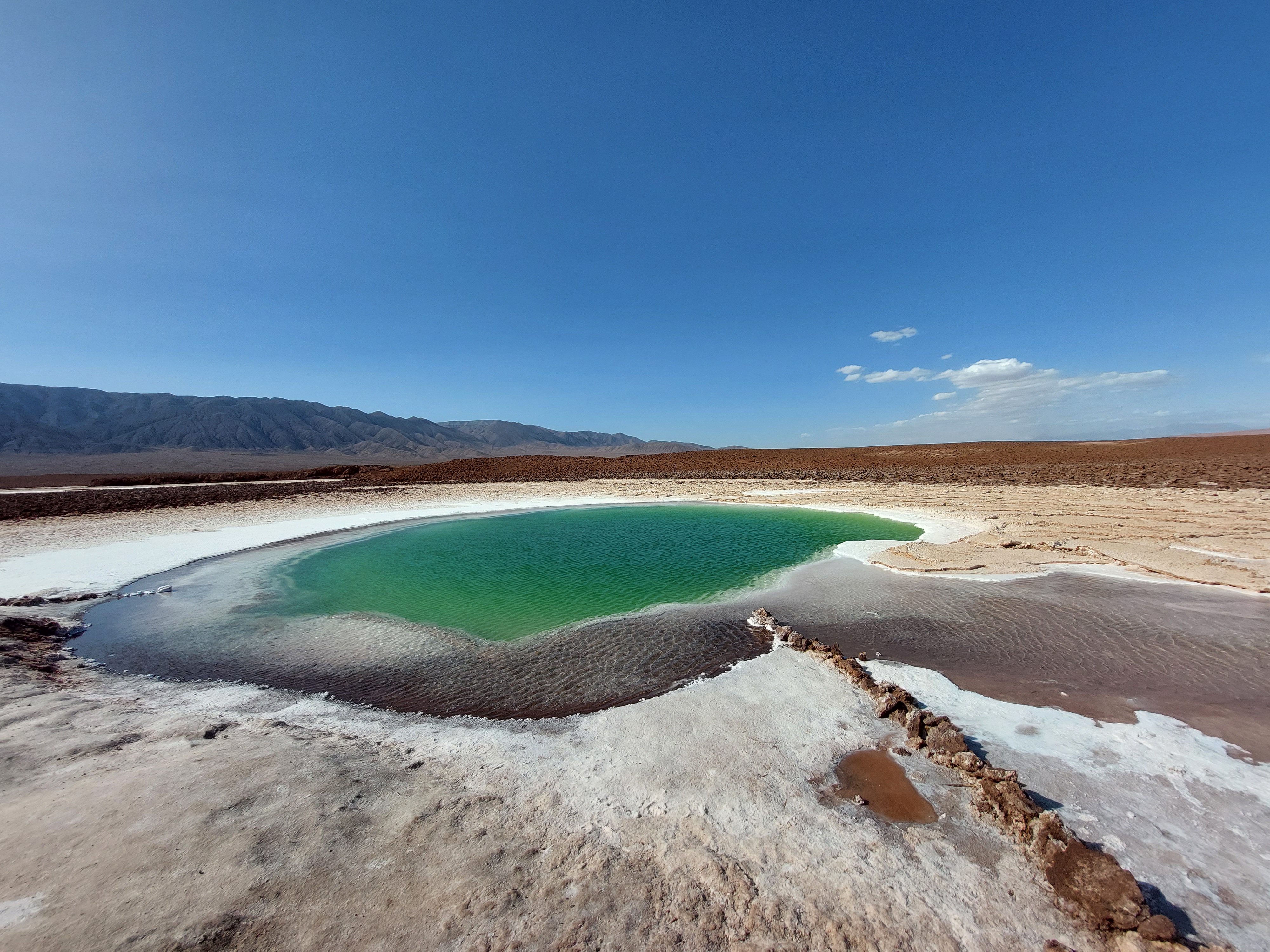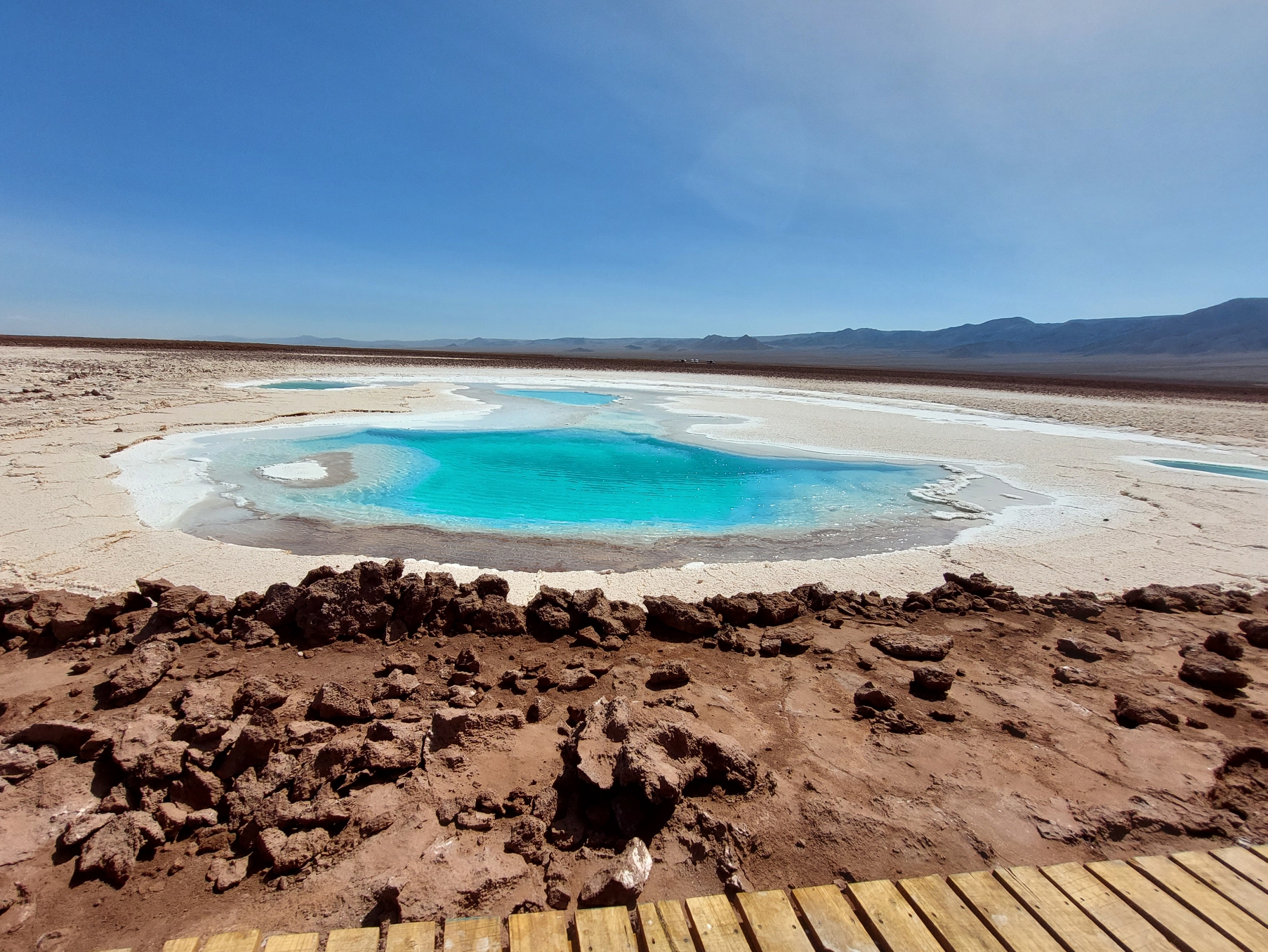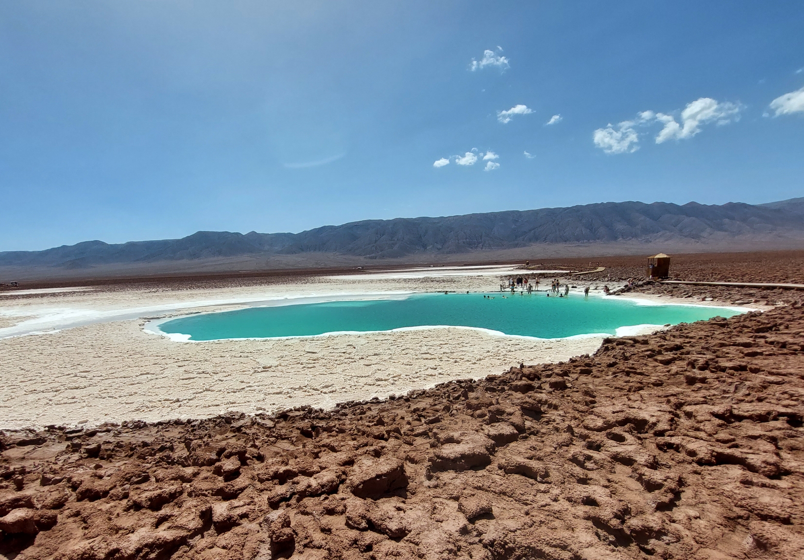 Fast wie am Mars Am Ziel angekommen findet man sieben Lagunen, von denen in zwei gebadet werden darf. Das strahlend türkise Wasser ist recht frisch, ideal als Abkühlung. Der Salzgehalt hier ist höher als im Toten Meer, was es fast unmöglich macht aufrecht im Wasser zu stehen. Mehr als 20 Minuten sollte man deshalb aus Gesundheitsgründen nicht im Wasser bleiben. Nach dem Bad sieht man die hohe Salzkonzentration auch am eigenen Körper. Ist das Wasser getrocknet belibt eine weiße Salzschicht übrig, daher muss nach dem Bad unbedingt nochmal geduscht werden.